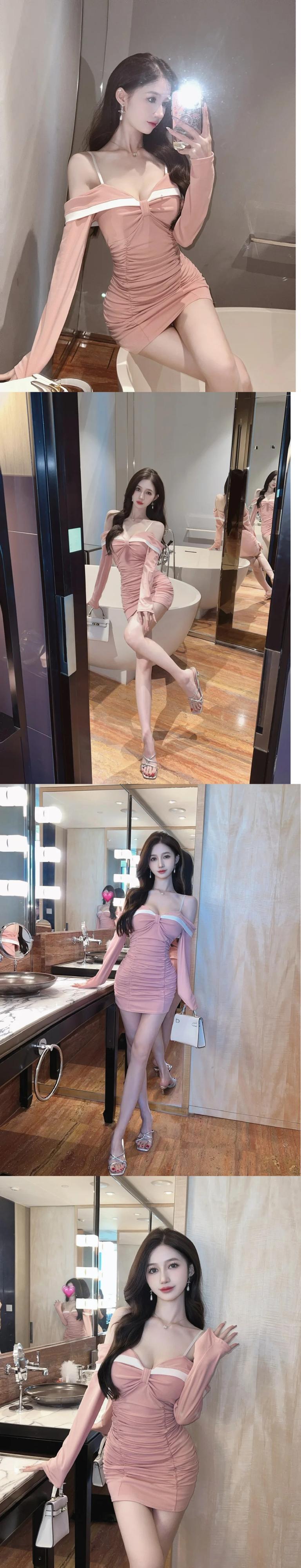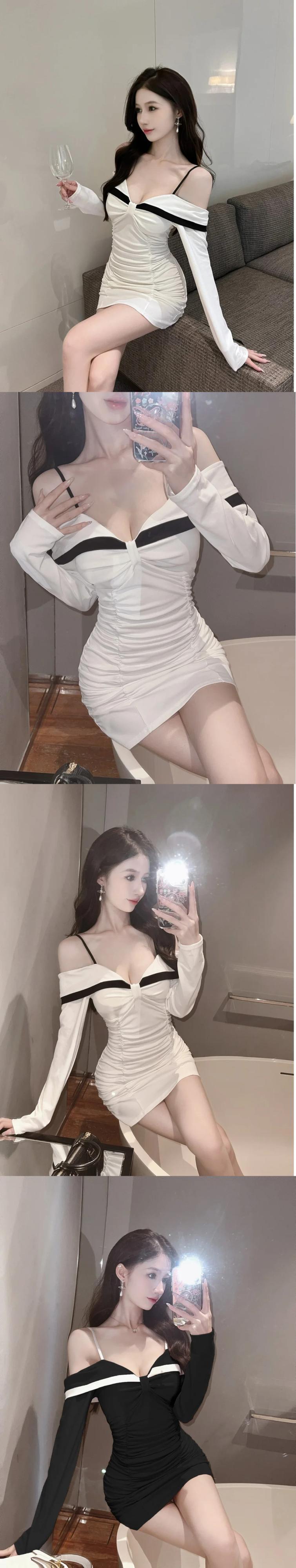 純粋セクシーホットガールオフショルダーストラップドレス秋長袖ヒップラップ V ネックボウショートドレス ロング リボン オータム 秋物 Vネック