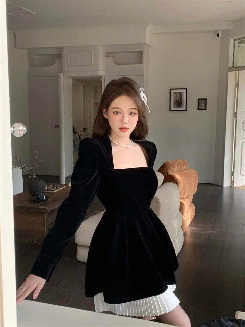 フレンチスイートホットガールスクエアカラーバブルスリーブドレス秋スリムフィットベルベットAラインドレス 大人ガーリー スウィート キュート カジュアル オータム 秋物 スクウェア