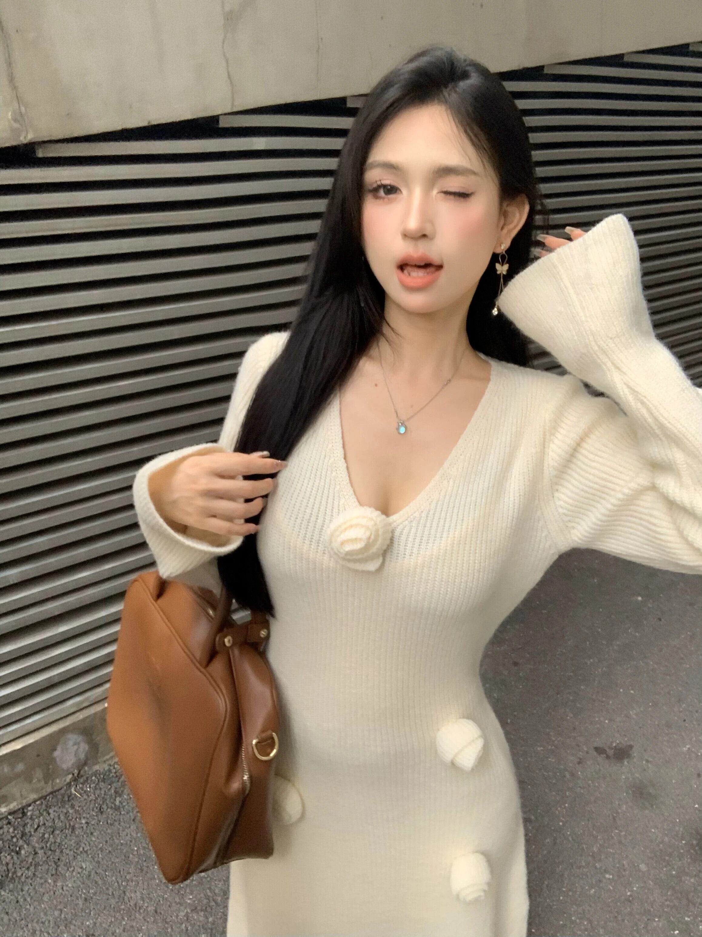 3D フラワー装飾 V ネックニットドレス秋/冬スリムフィット長袖 A ラインロングドレス オータム 秋物 ウィンター 冬物 Vネック Aライン フラワーデザイン