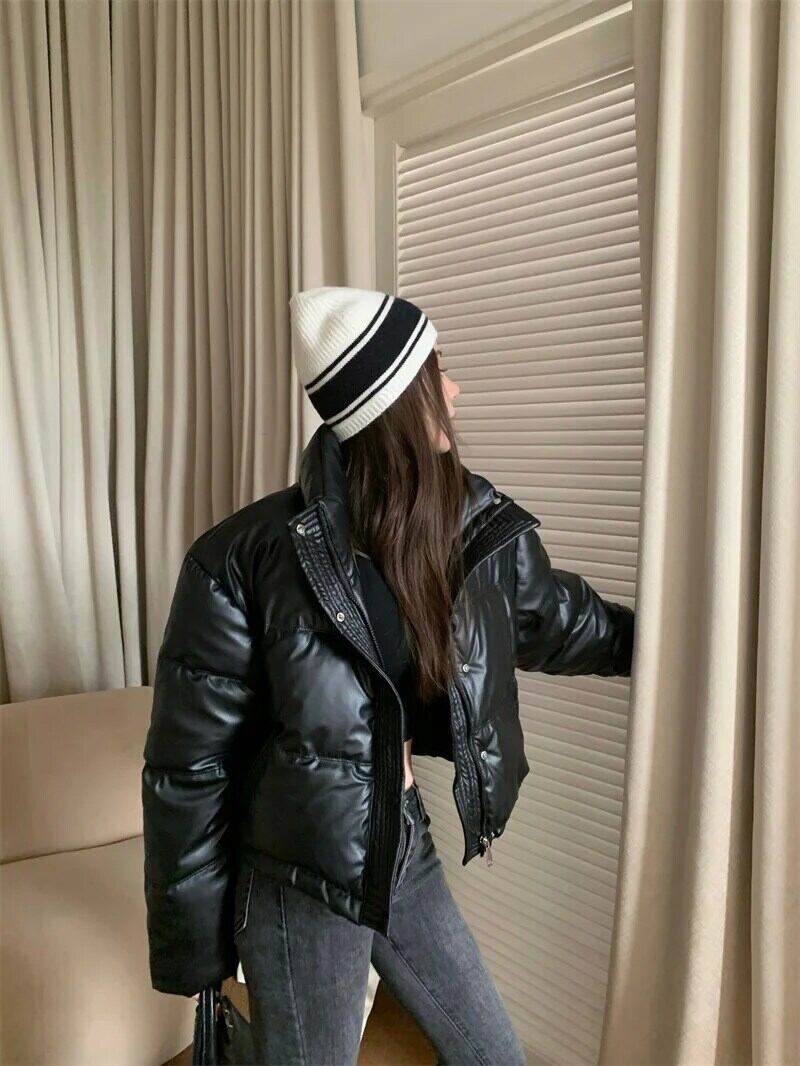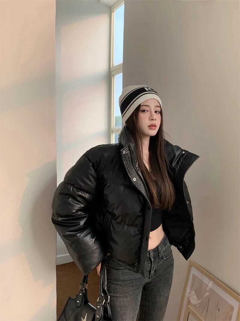 甘いホットガール黒スタンドカラー肥厚 Pu レザーコットンジャケット冬ルーズフィット暖かいコットンジャケット ブラック 大人ガーリー スウィート キュート カジュアル ウィンター 冬物
