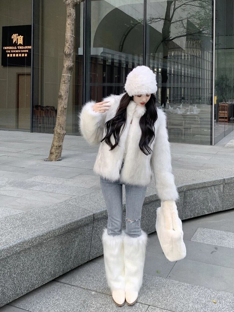 Sweet Girl ホワイトフェイクファー長袖ショートコート秋と冬ルーズぬいぐるみジャケット ロング 大人ガーリー スウィート キュート カジュアル オータム 秋物 ウィンター 冬物