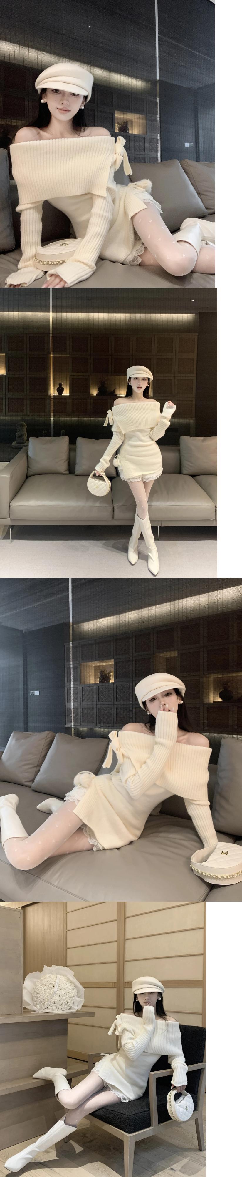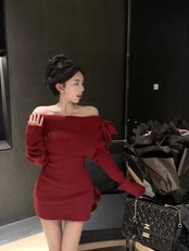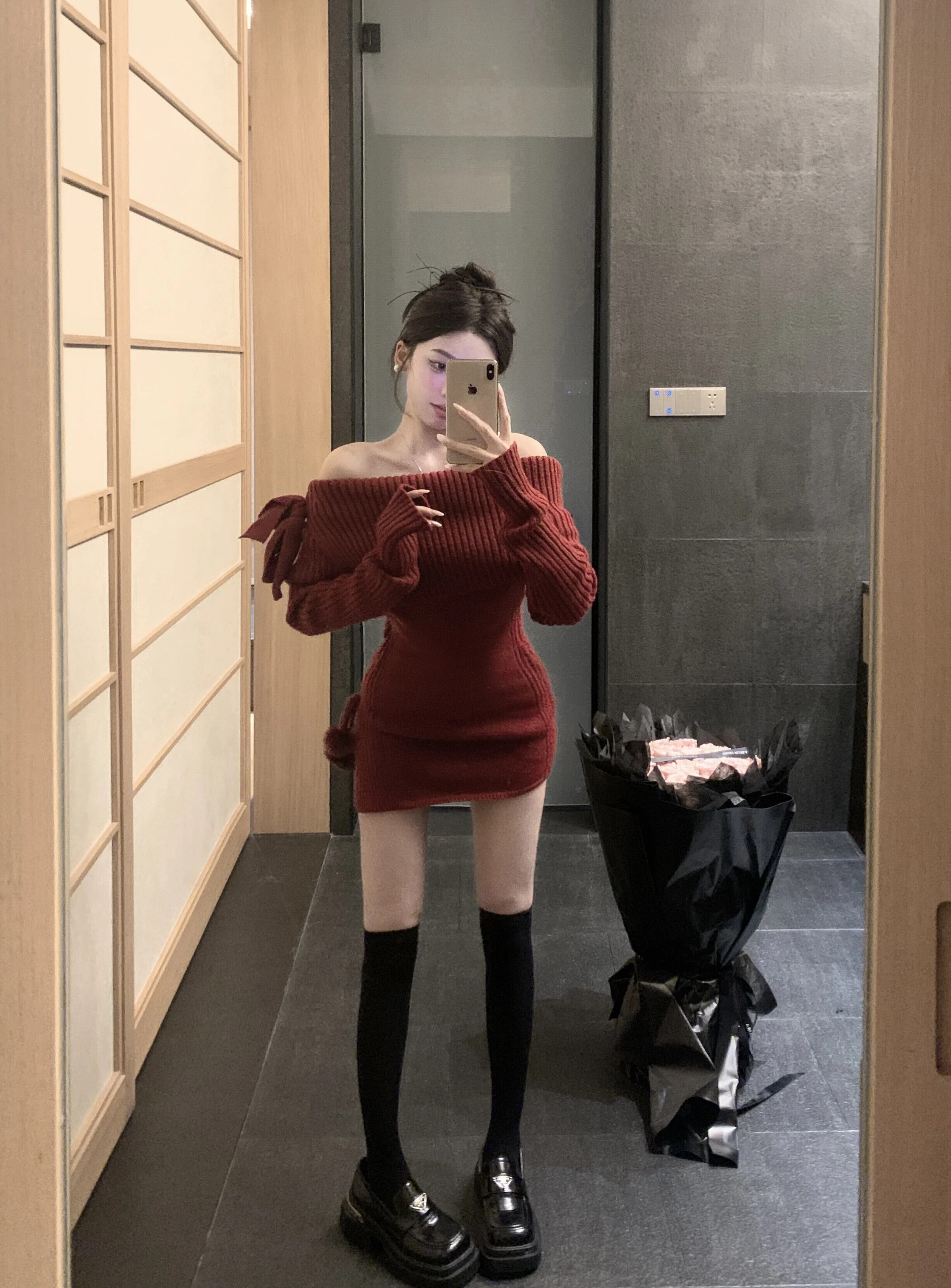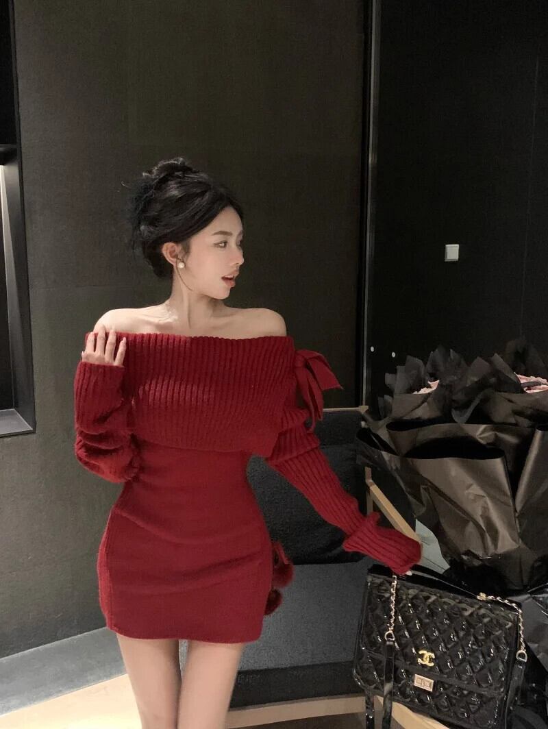 甘いホットガールオフショルダー長袖ニットプルオーバー秋スラッシュネックスリムフィット弓セーター ロング リボン 大人ガーリー スウィート キュート カジュアル オータム 秋物