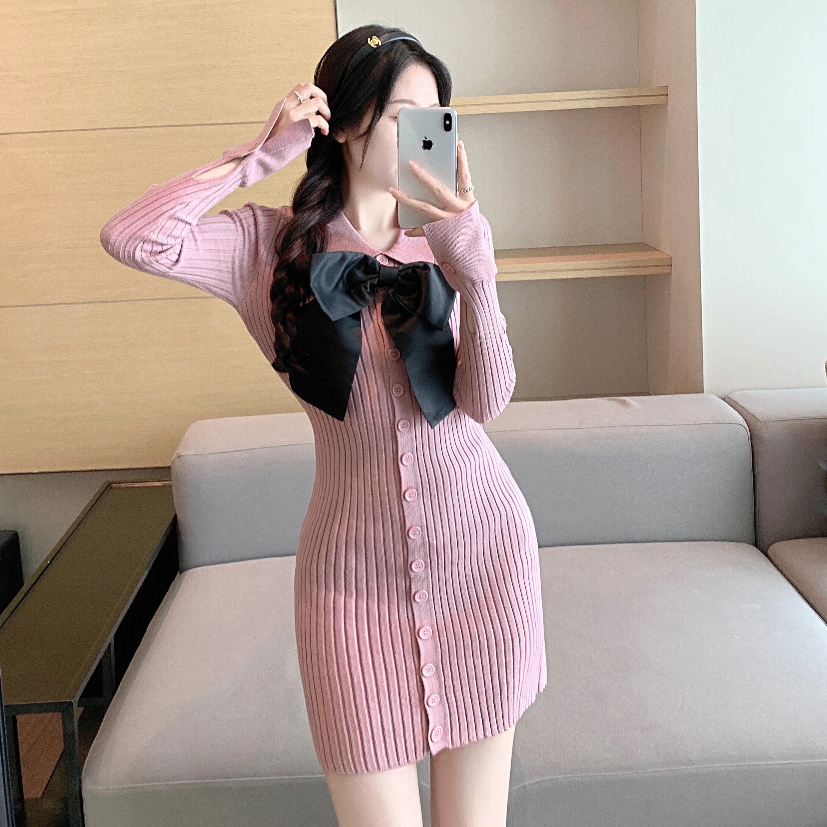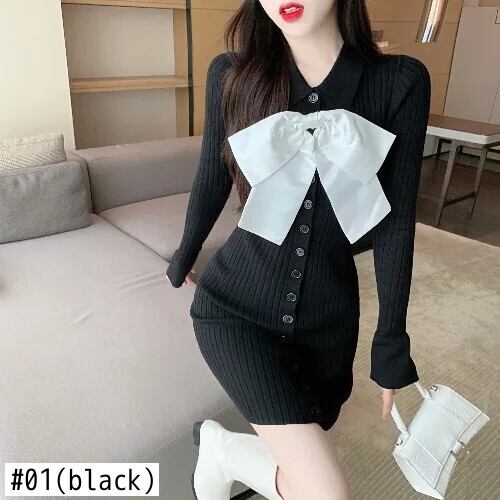フレンチスタイル甘いホットガールボウニットドレス秋スリムフィットターンダウン襟ボウラップヒップドレス リボン 大人ガーリー スウィート キュート カジュアル オータム 秋物