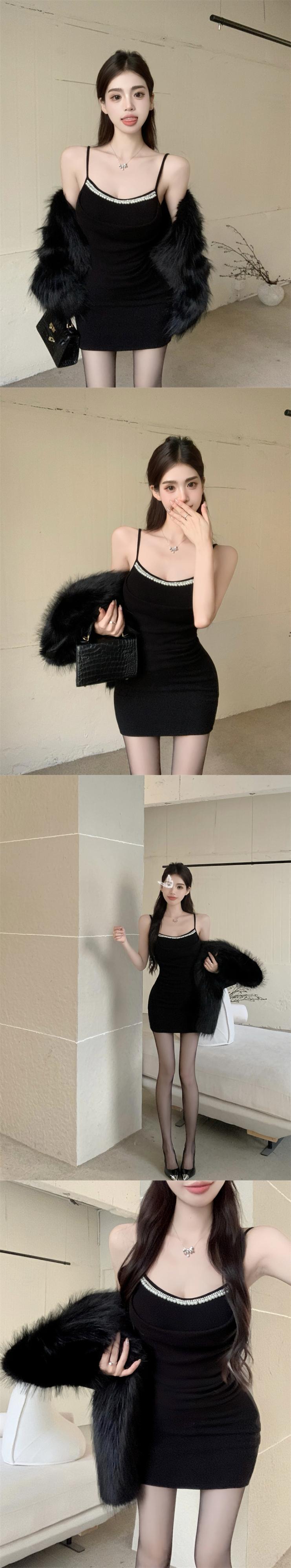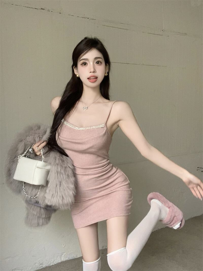 甘いスパイシーガールピンクパールストラップドレス秋と冬スリムフィットラップヒップ A ラインショートドレス 大人ガーリー スウィート キュート カジュアル オータム 秋物 ウィンター 冬物 Aライン 真珠