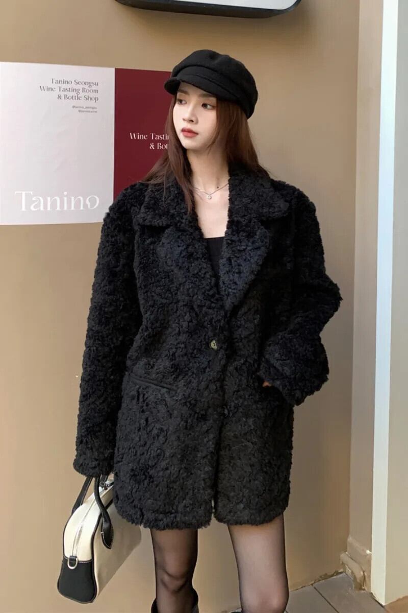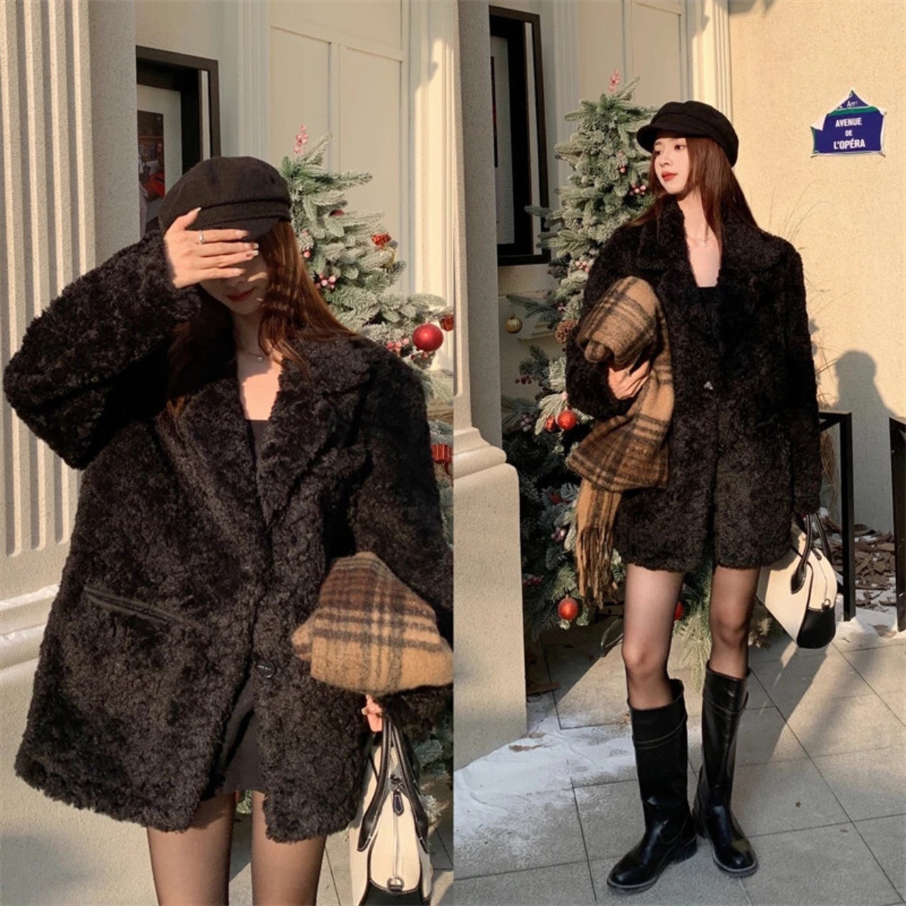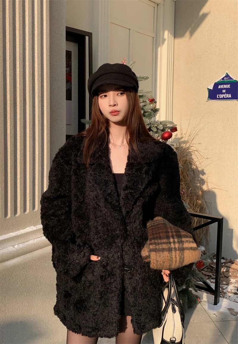 甘いホットガール黒ラムウールスーツジャケット秋/冬肥厚ルーズミディアム丈毛皮テーラードコート レッド ブラック 大人ガーリー スウィート キュート カジュアル オータム 秋物 ウィンター 冬物