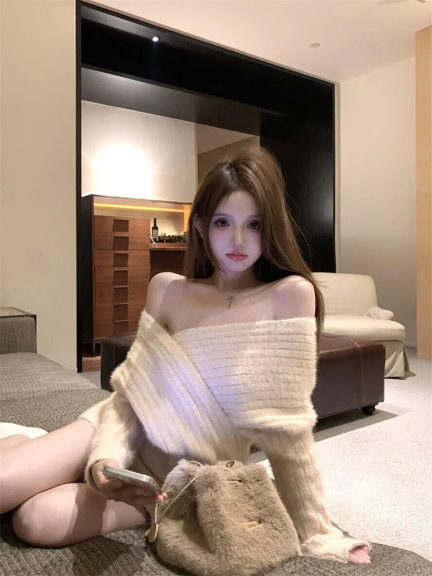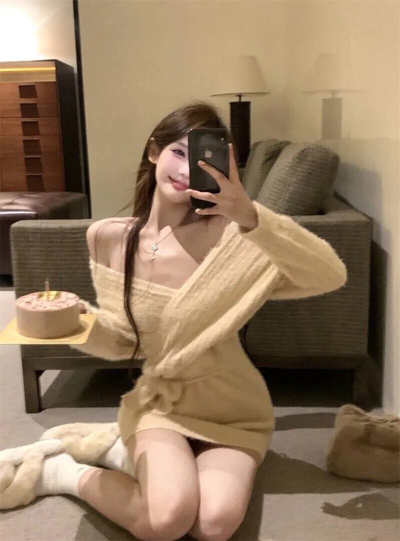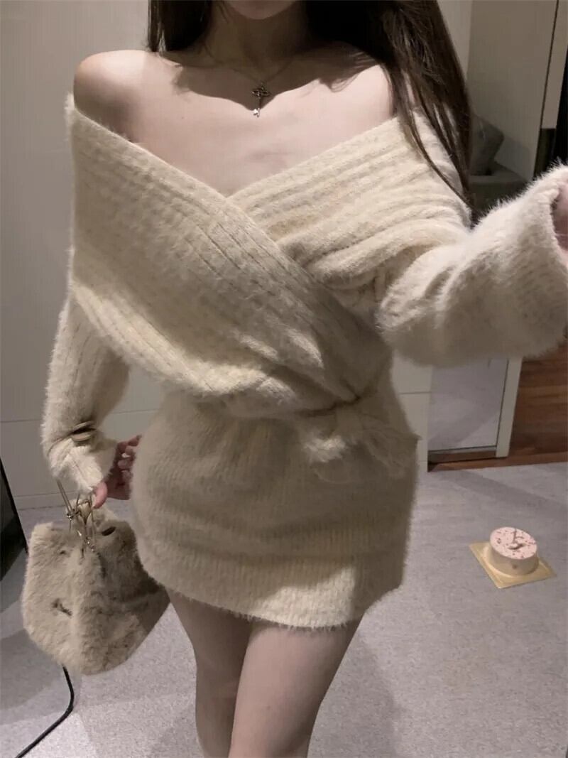 スウィートガールクロス V ネックオフショルダーニットドレス秋と冬セクシーレースアップヒップラップショートドレス 大人ガーリー キュート カジュアル オータム 秋物 ウィンター 冬物 Vネック