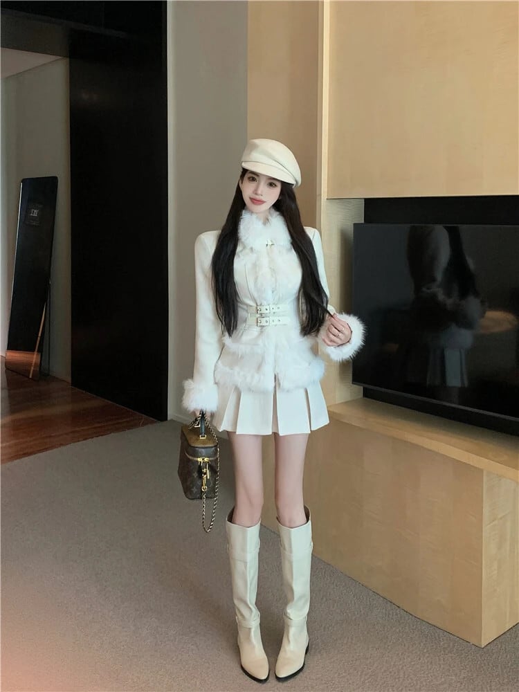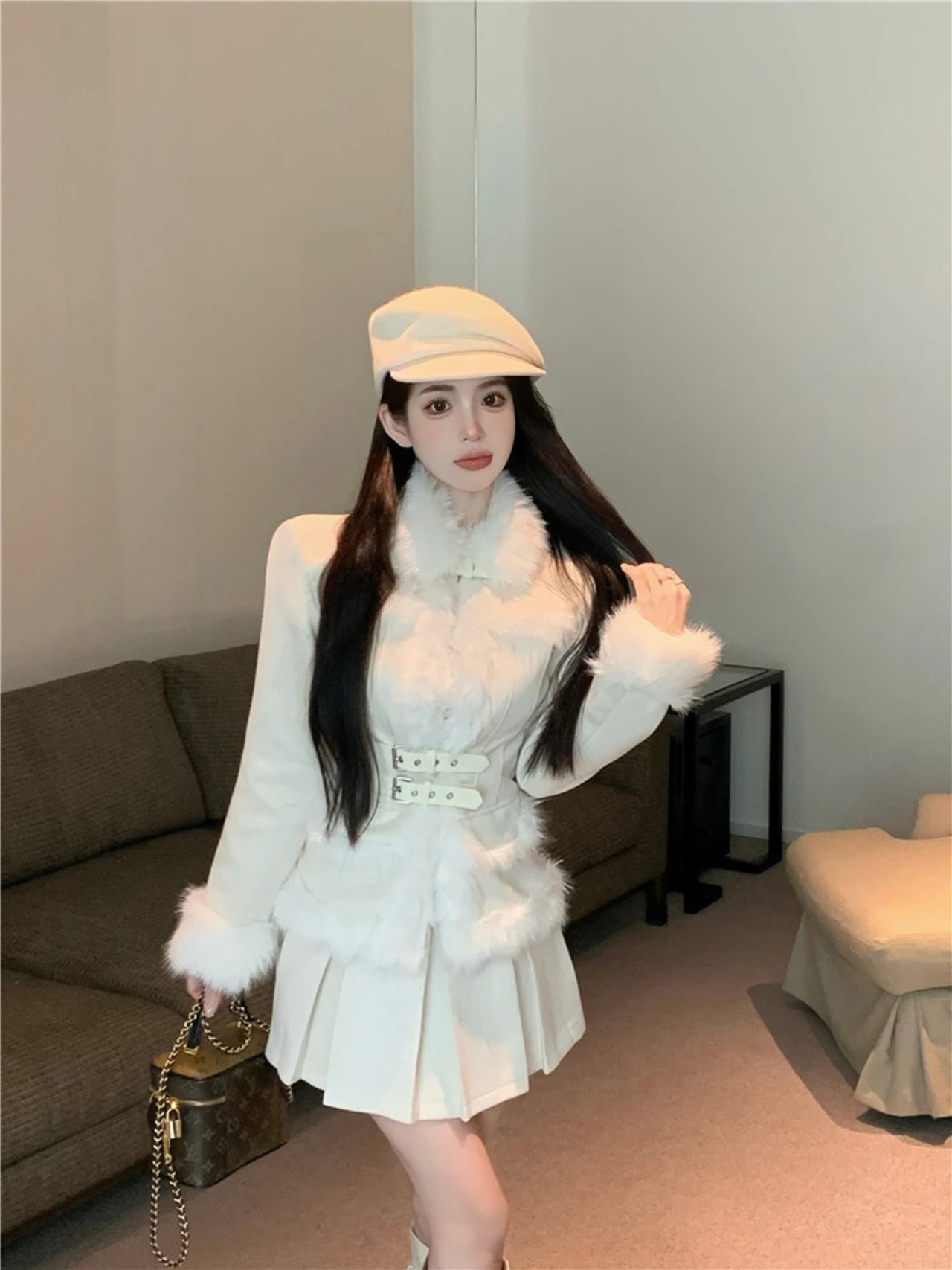 甘いホットガールスーツ秋と冬ファーパッチワークスエードコットンジャケットウエストプリーツスカート 2 点セット スウェード 大人ガーリー スウィート キュート カジュアル オータム 秋物 ウィンター 冬物