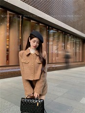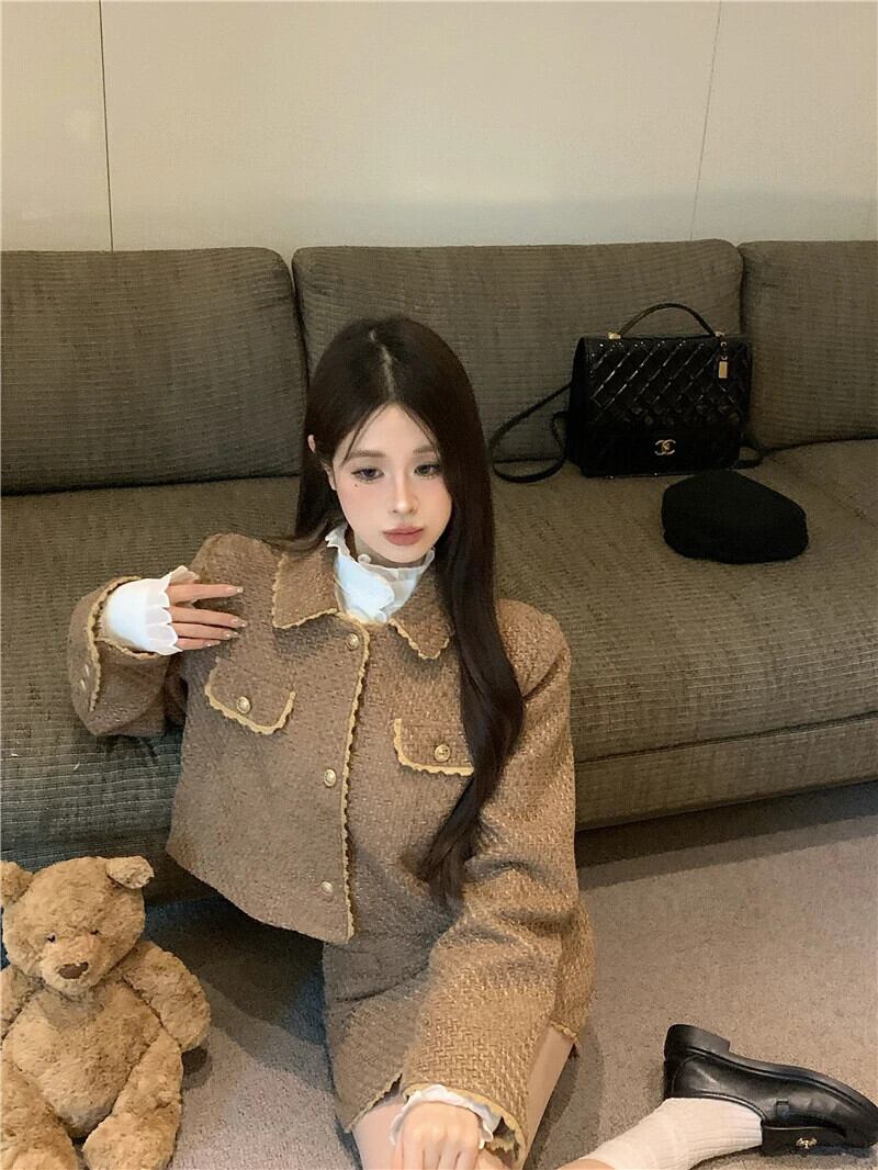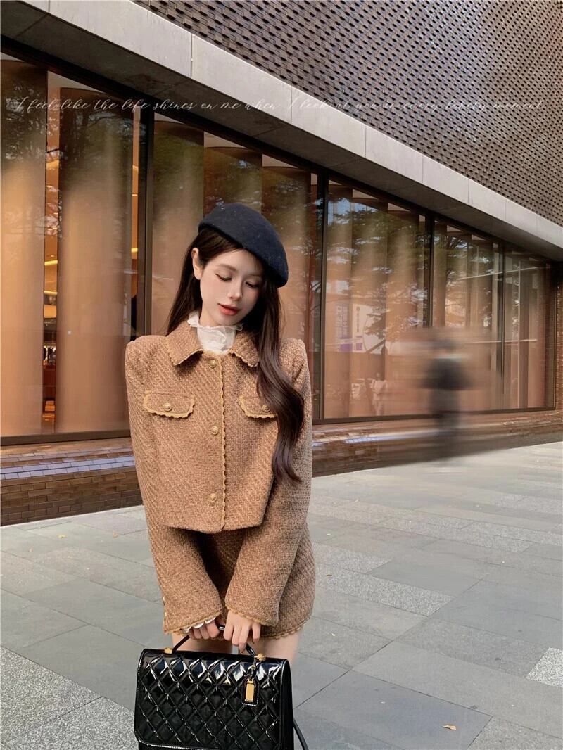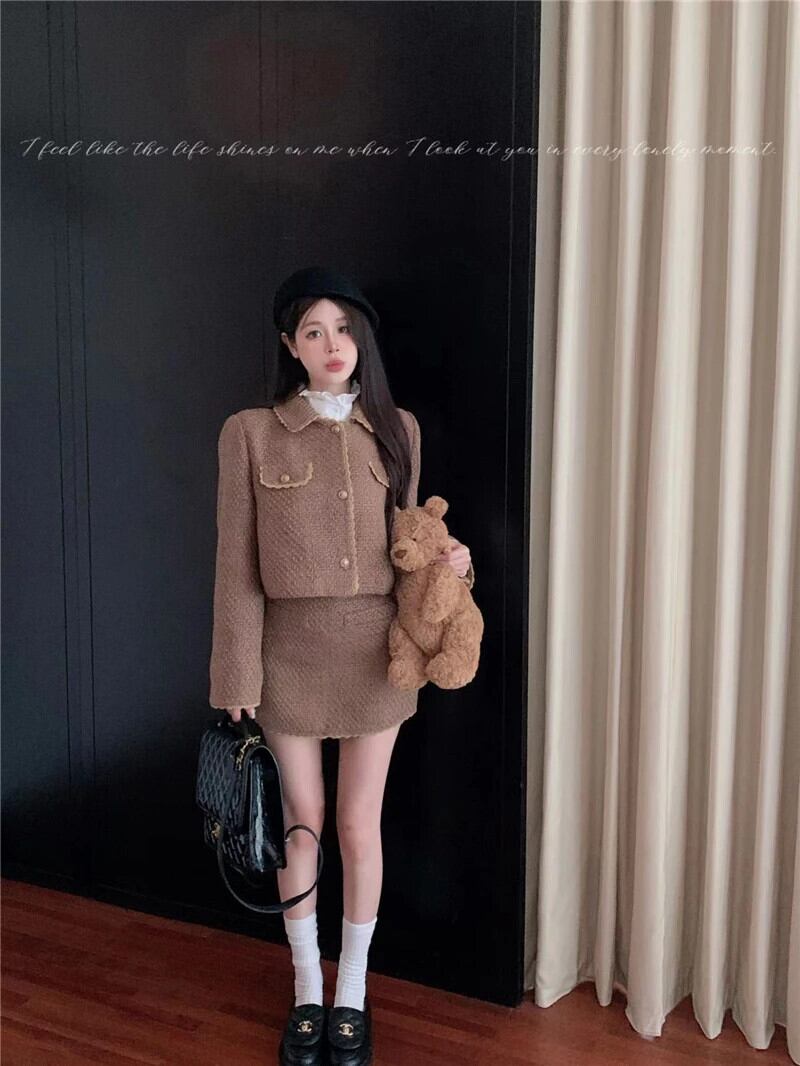 スイートガールスーツ秋/冬ツイードターンダウン襟コットンジャケットラップヒップスカートツーピースセット 大人ガーリー スウィート キュート カジュアル オータム 秋物 ウィンター 冬物