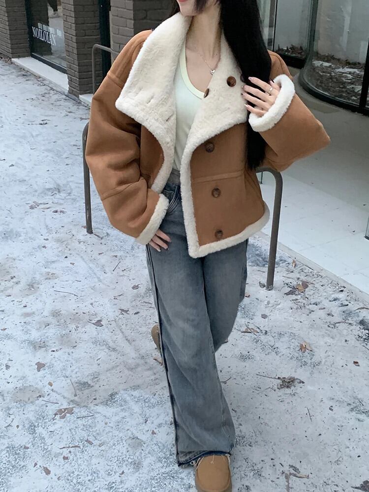ホットガールスエードオートバイコート秋/冬ルーズターンダウン襟肥厚両面毛皮ジャケット スウェード オータム 秋物 ウィンター 冬物