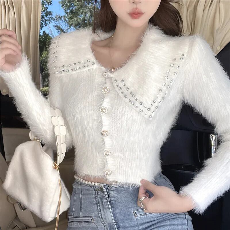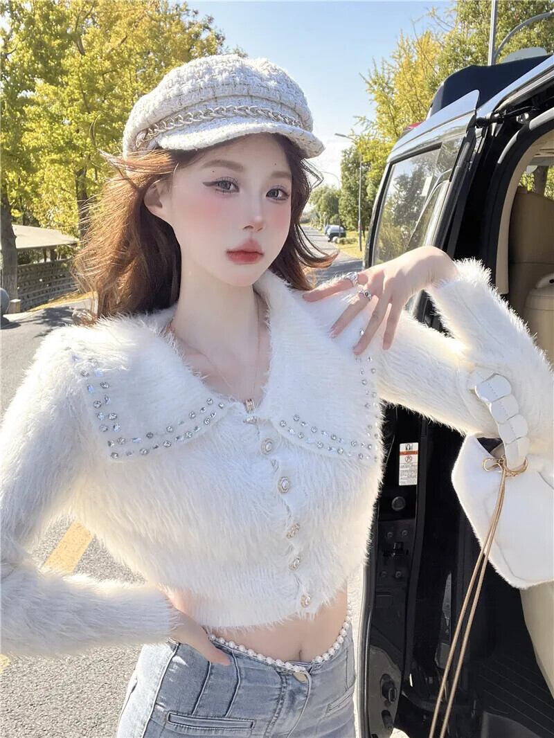 フレンチスイートホットガールルーズニットカーディガン冬ダイヤモンドターンダウンカラーセーター 大人ガーリー スウィート キュート カジュアル ウィンター 冬物