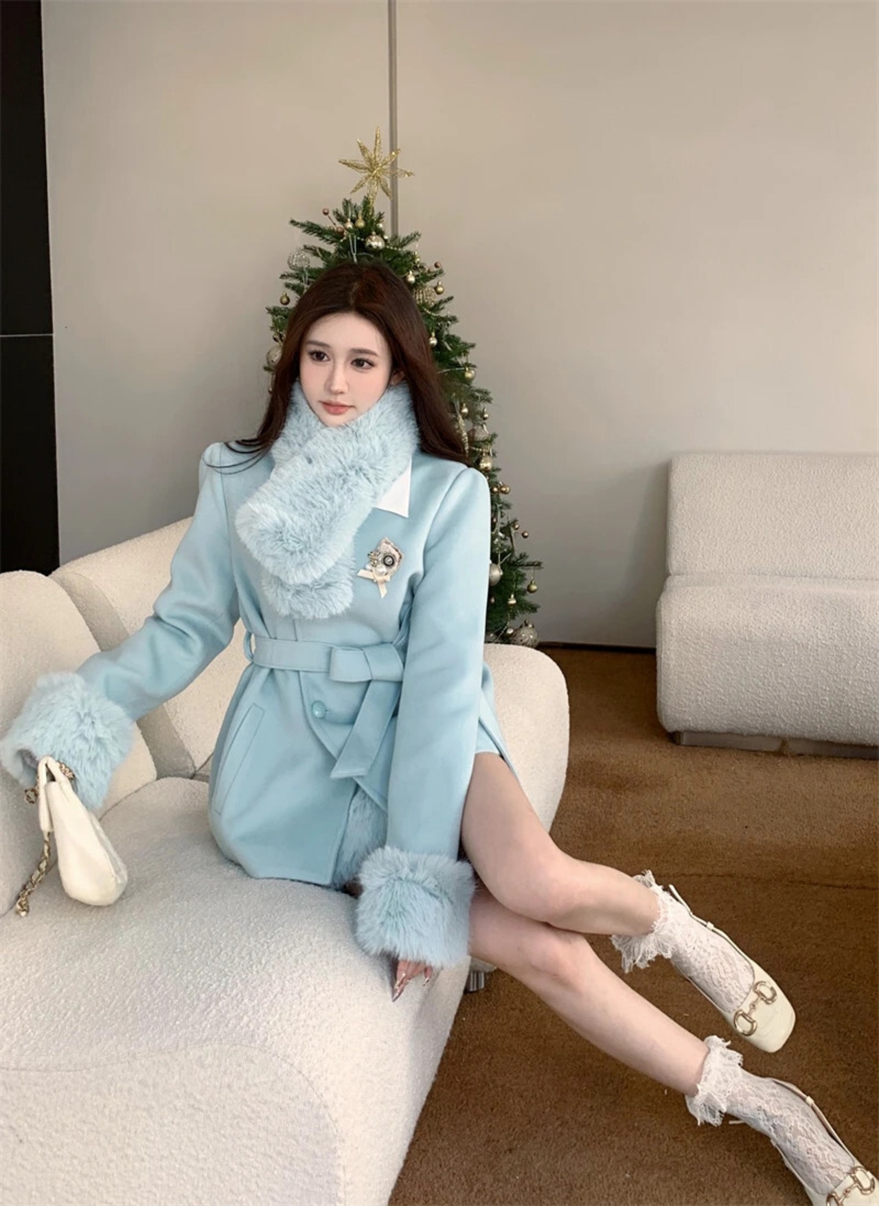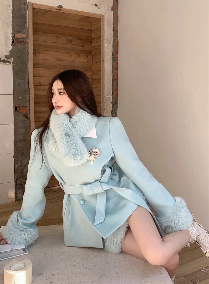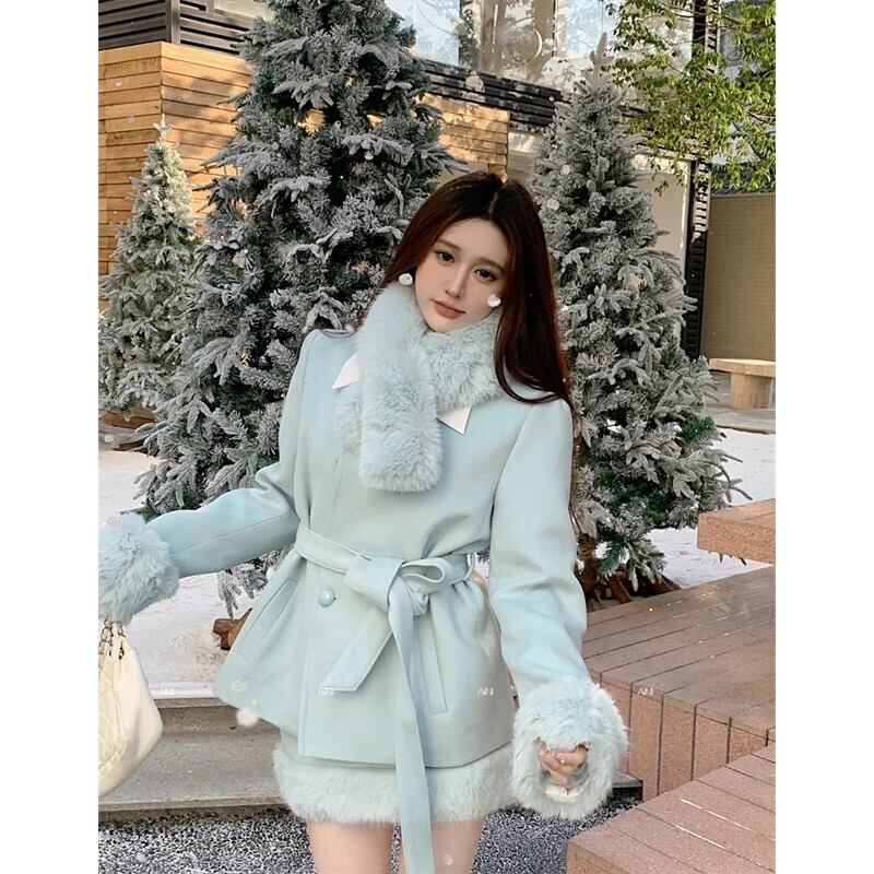 スイートガールスーツ秋/冬毛皮襟ウールフィットコートウエストミニスカートツーピースセット 大人ガーリー スウィート キュート カジュアル オータム 秋物 ウィンター 冬物