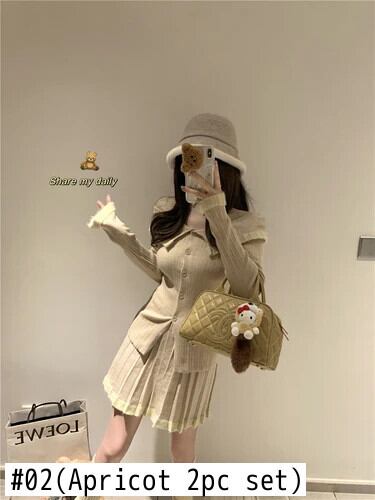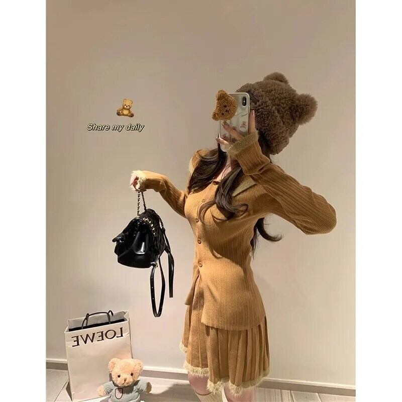 Sweet Hot Girl スーツ レディース 秋冬 オフショルダー ニットカーディガン ウエストプリーツ ミニスカート 2点セット 大人ガーリー スウィート キュート カジュアル オータム 秋物 ウィンター 冬物