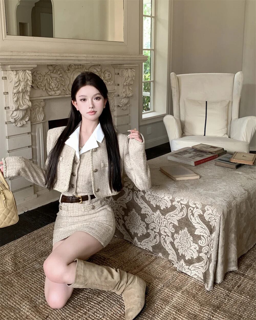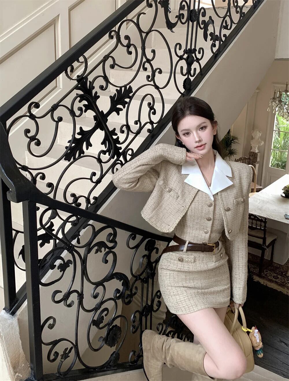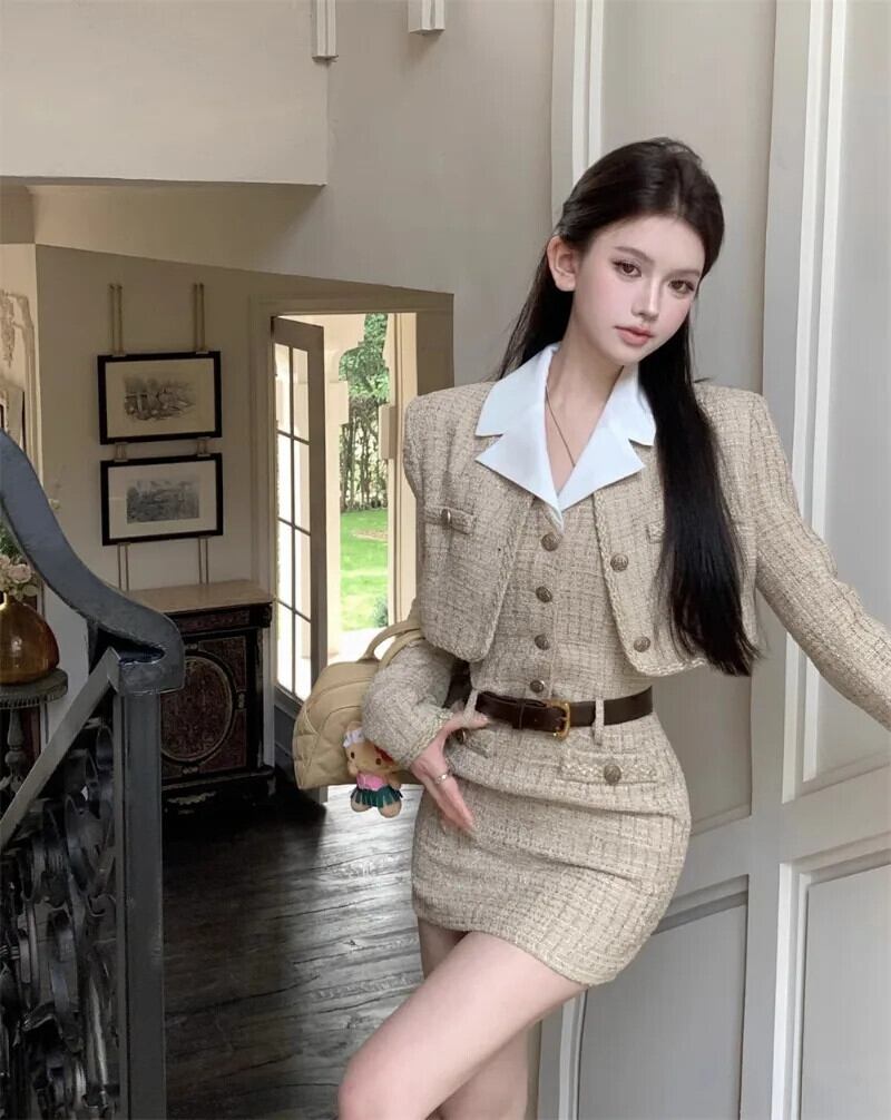 Sweet Girl ツイードスーツ レディース 秋冬 長袖ショートコート ノッチカラー ノースリーブドレス ツーピースセット ロング 大人ガーリー スウィート キュート カジュアル オータム 秋物 ウィンター 冬物