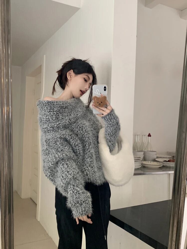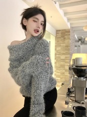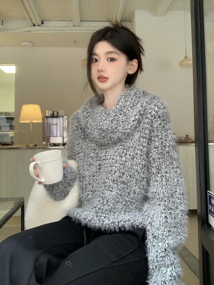 ホットガールモヘアタートルネックセーター冬ルーズフィットウォームグレーニットプルオーバー ウィンター 冬物