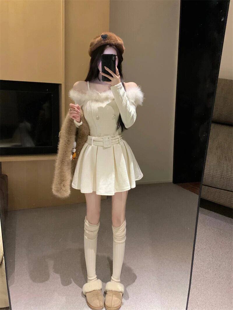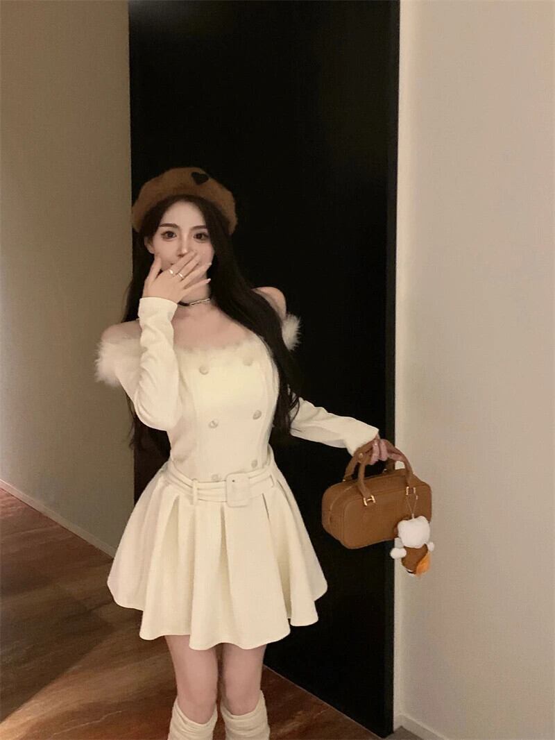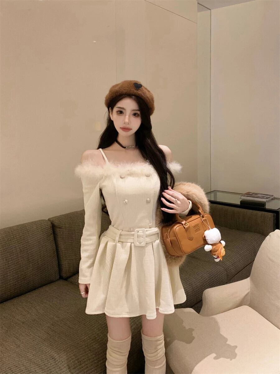 甘いホットガールオフショルダースラッシュネックドレス秋と冬スリムフィットベルトニット A ラインドレス 大人ガーリー スウィート キュート カジュアル オータム 秋物 ウィンター 冬物 ハーネス Aライン