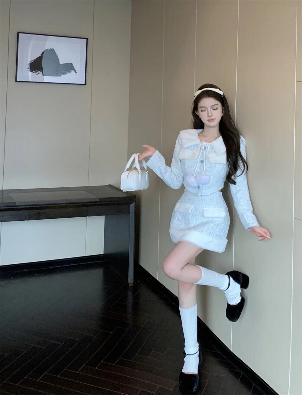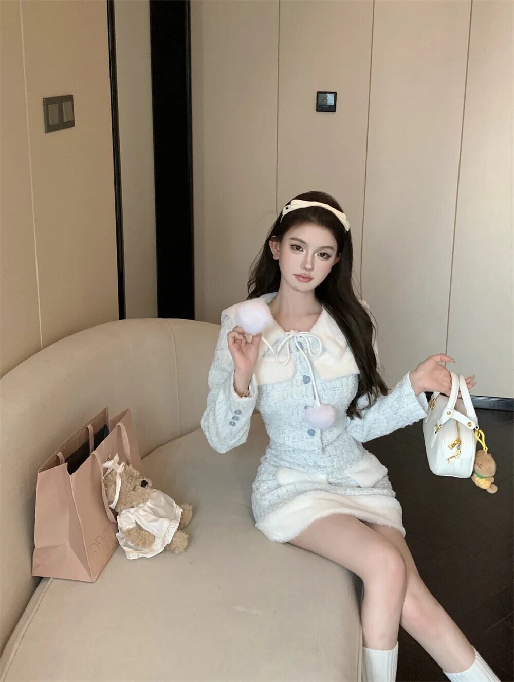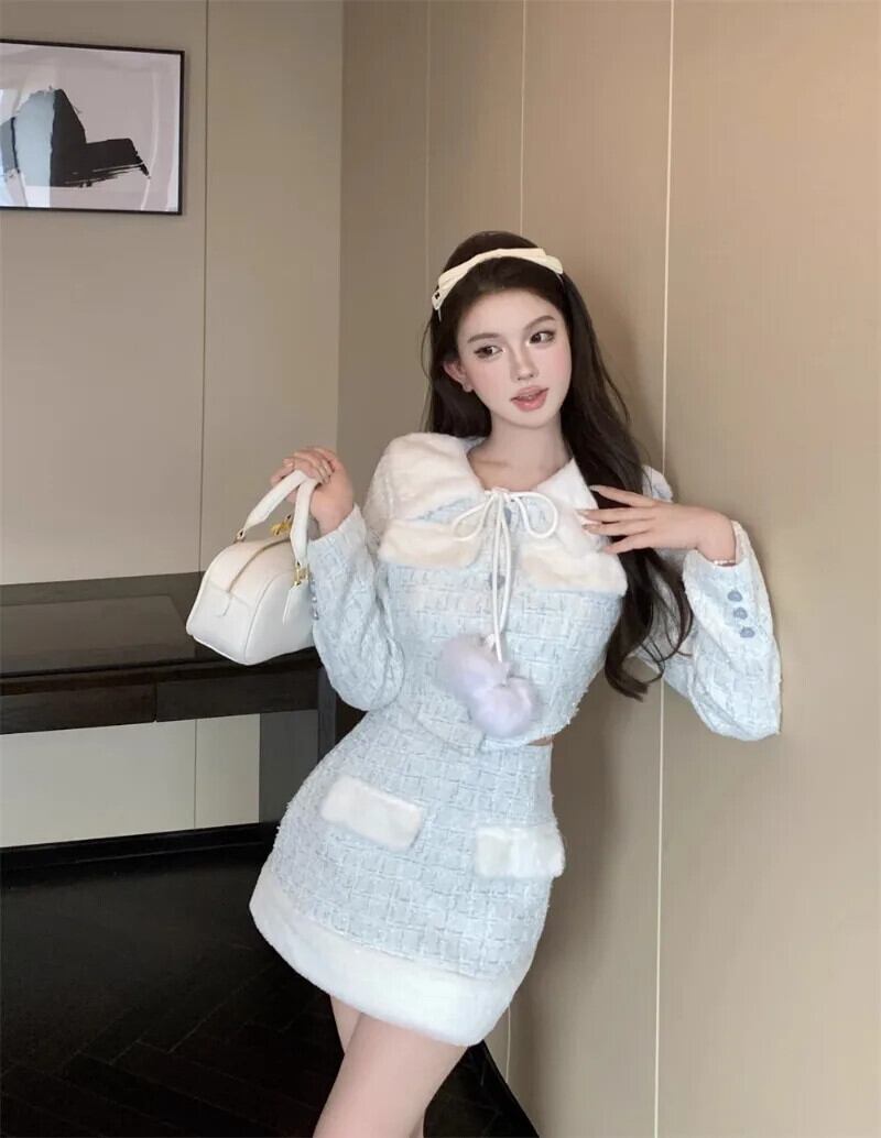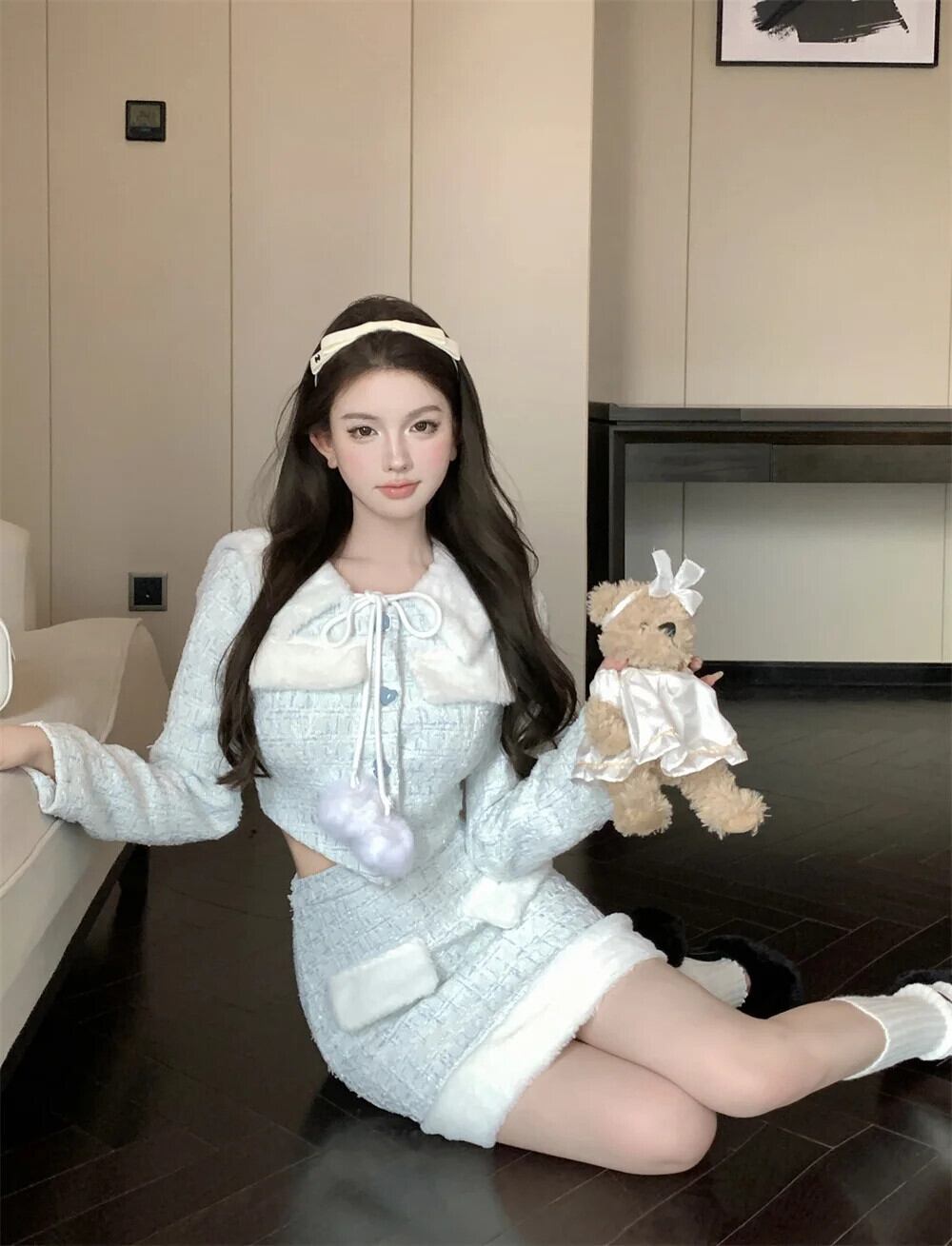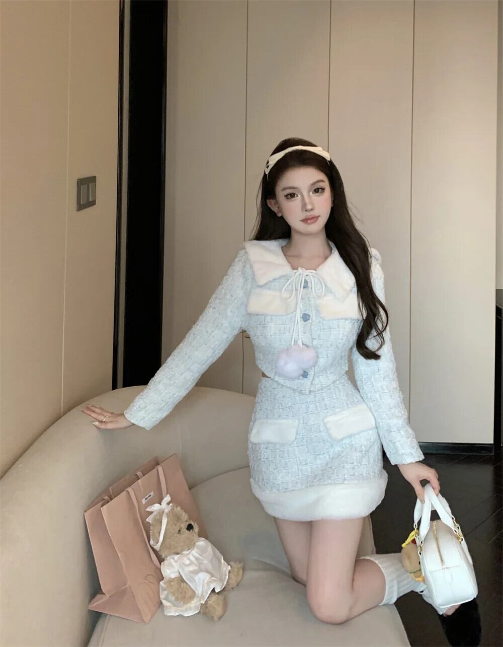 甘いホットガールスーツ秋/冬毛皮襟ツイードショートジャケットウエストミニスカート 2 点セット 大人ガーリー スウィート キュート カジュアル オータム 秋物 ウィンター 冬物