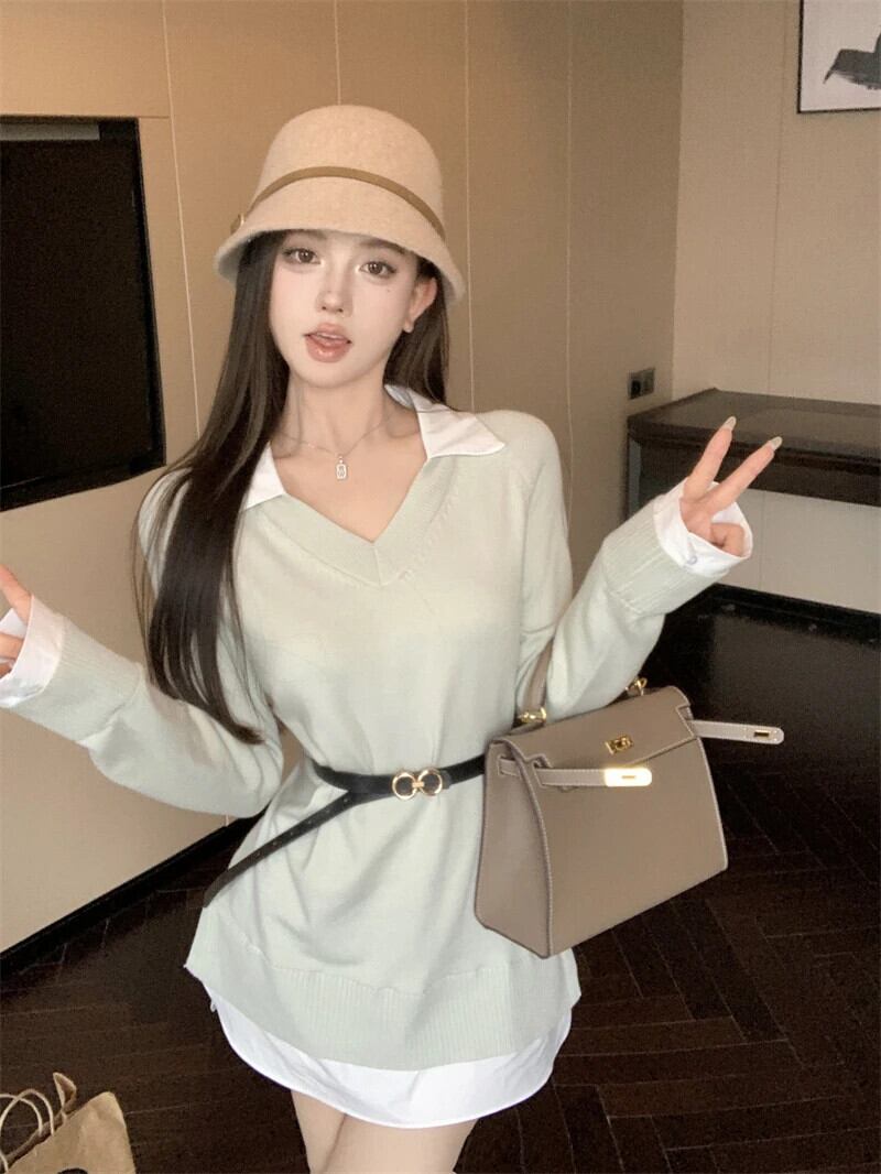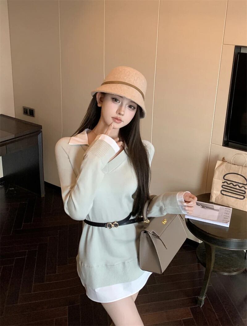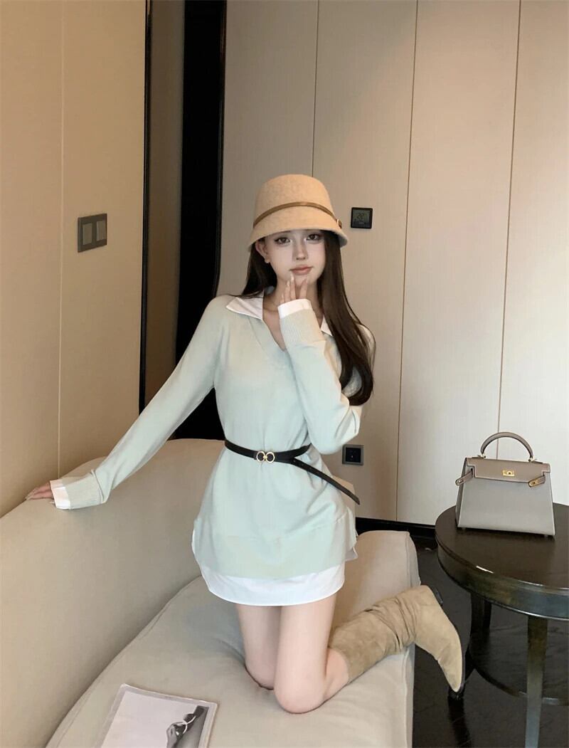 フレンチホットガール純粋セクシースリムフィットニットドレス秋/冬フェイクツーピースポロネックセータードレス オータム 秋物 ウィンター 冬物 Oネック ピュア