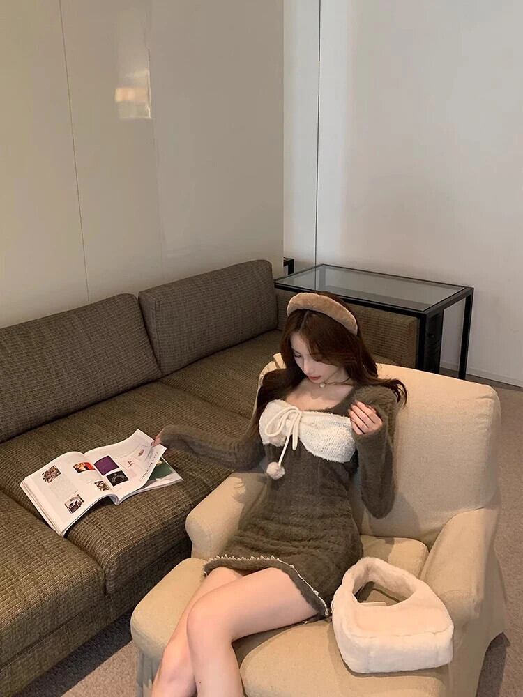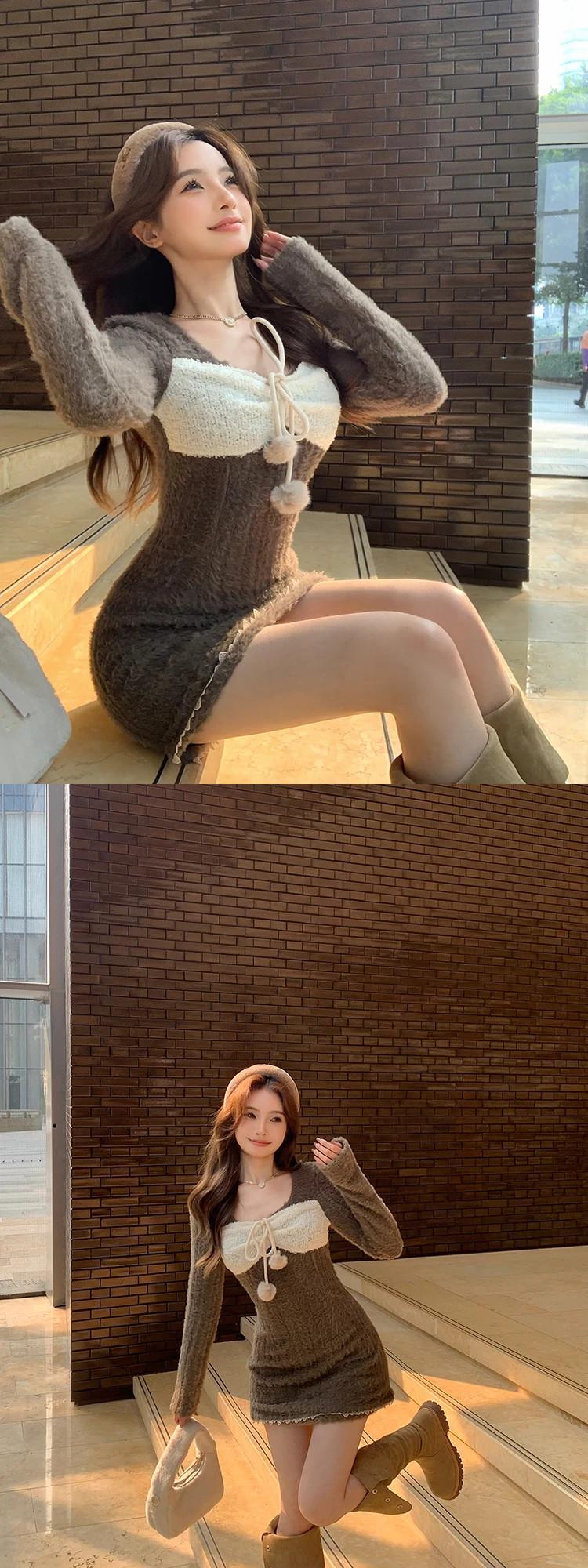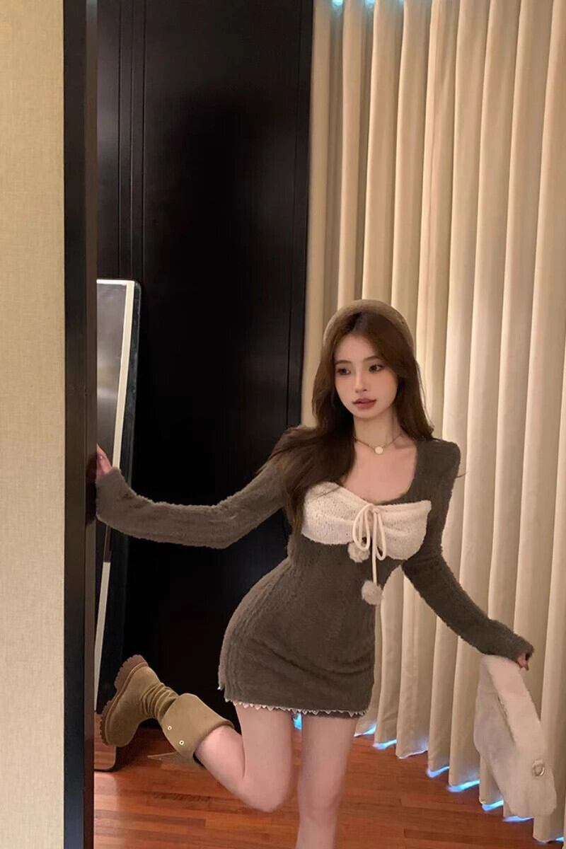 甘いホットガールズスクエアカラーレースアップ長袖ニットドレス秋と冬スリムフィットラップヒップショートドレス ロング 大人ガーリー スウィート キュート カジュアル オータム 秋物 ウィンター 冬物 スクウェア