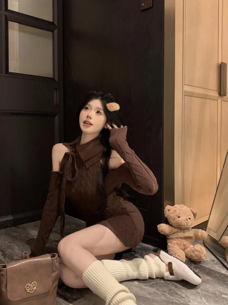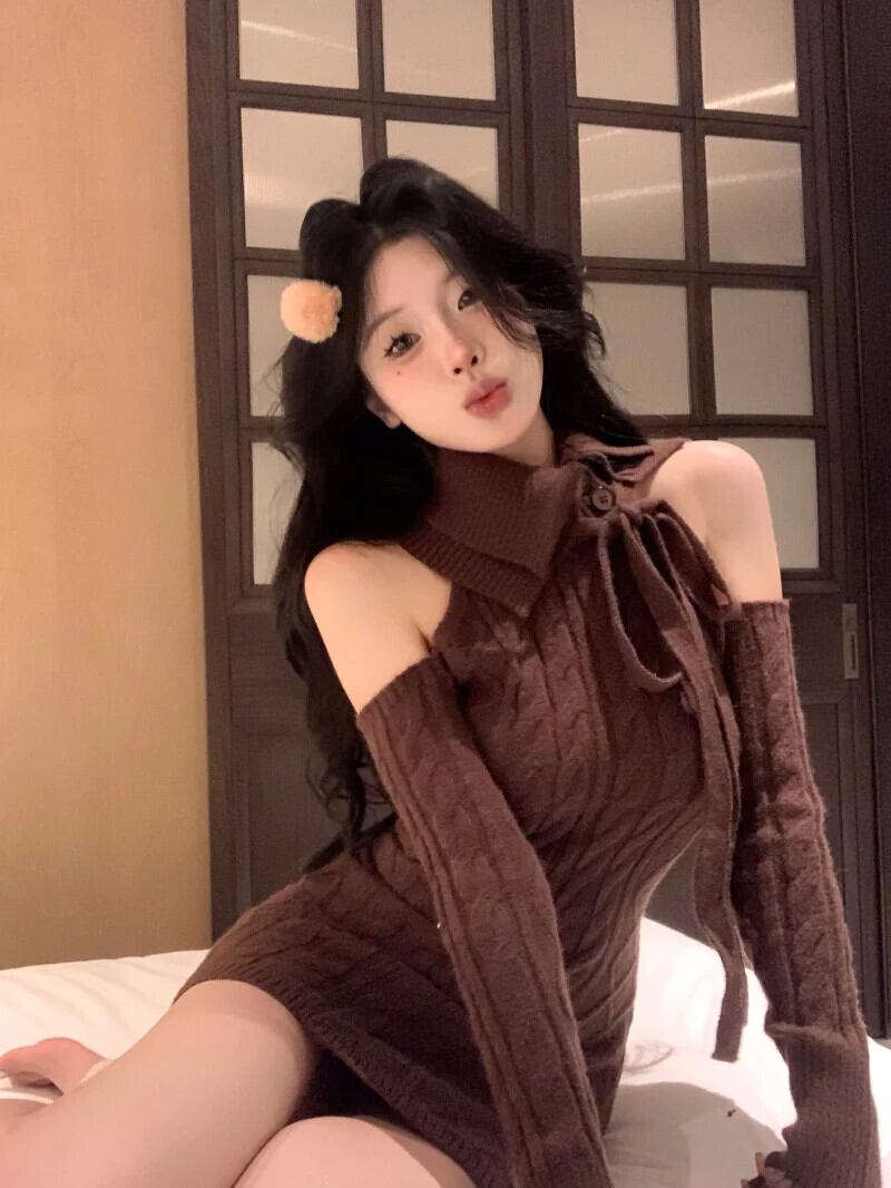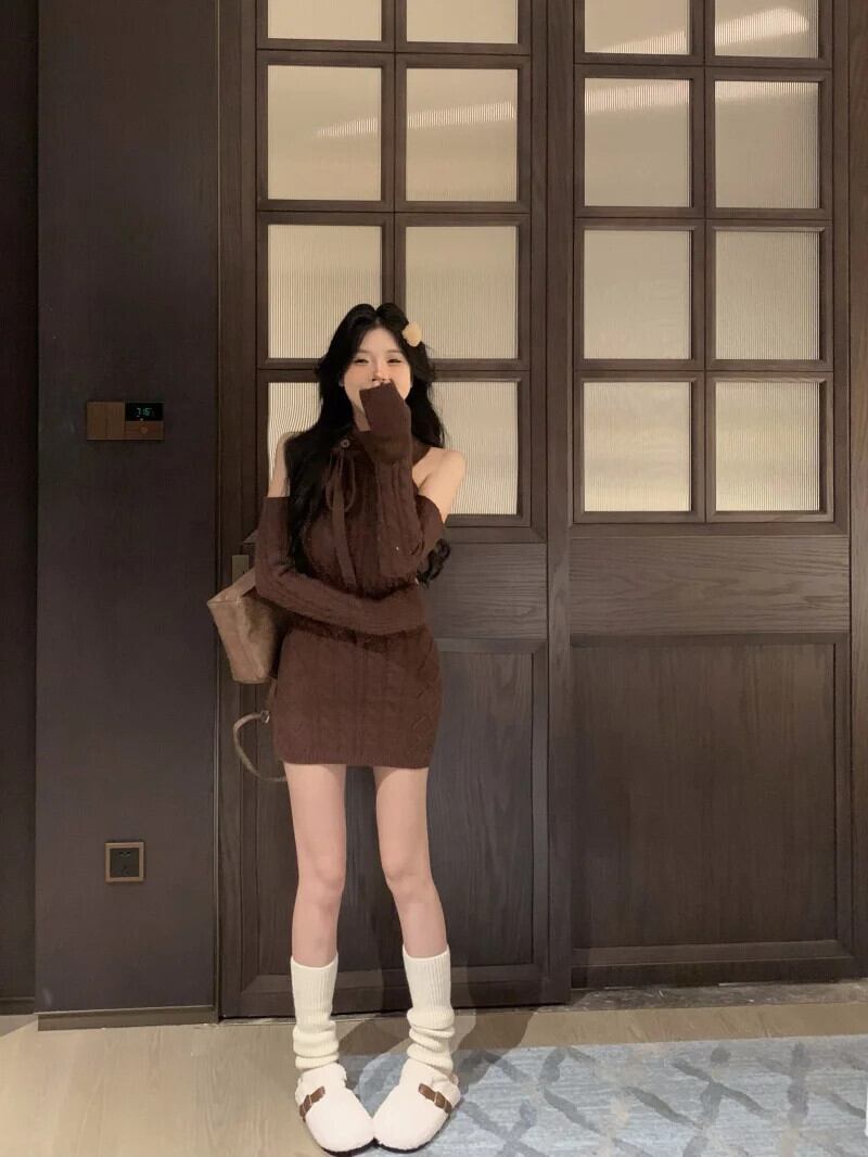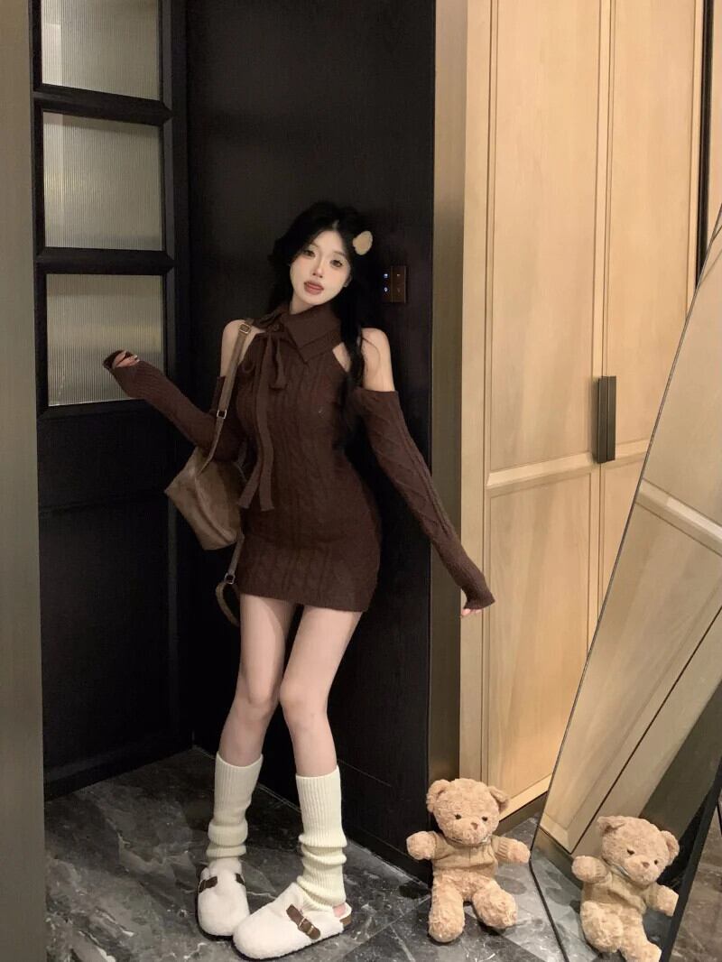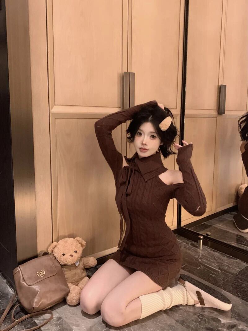 甘いホットガールレースアップオフショルダーニットドレス秋と冬長袖スリムフィットラップヒップショートドレス ロング 大人ガーリー スウィート キュート カジュアル オータム 秋物 ウィンター 冬物