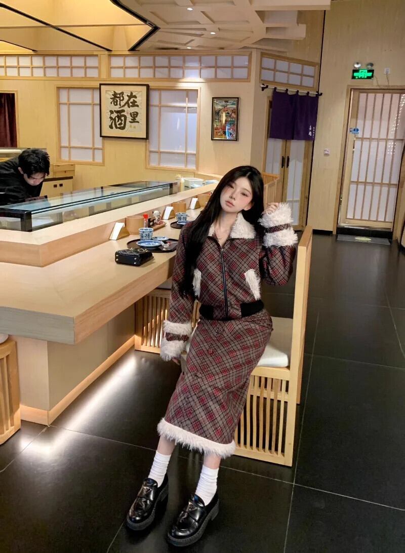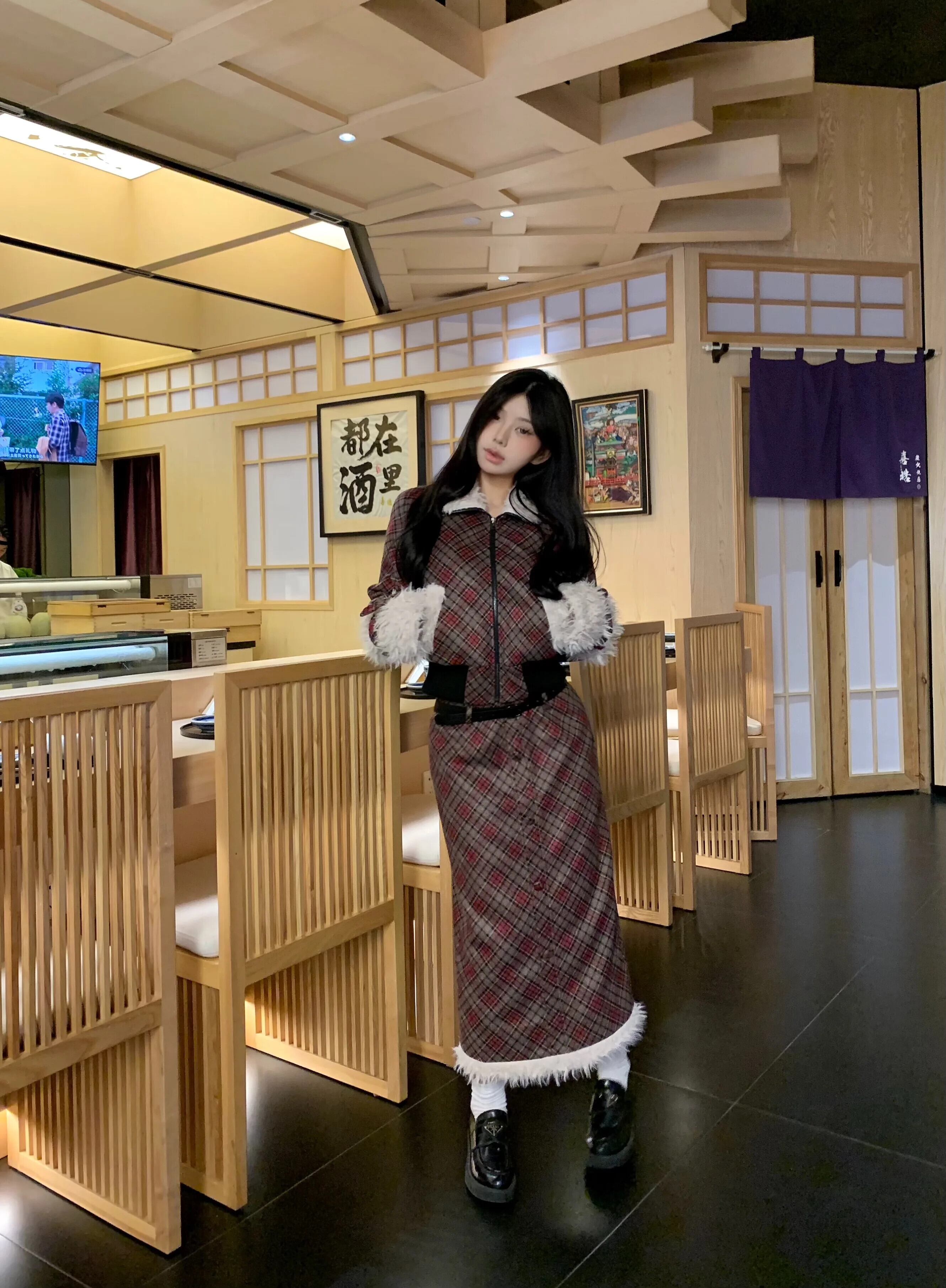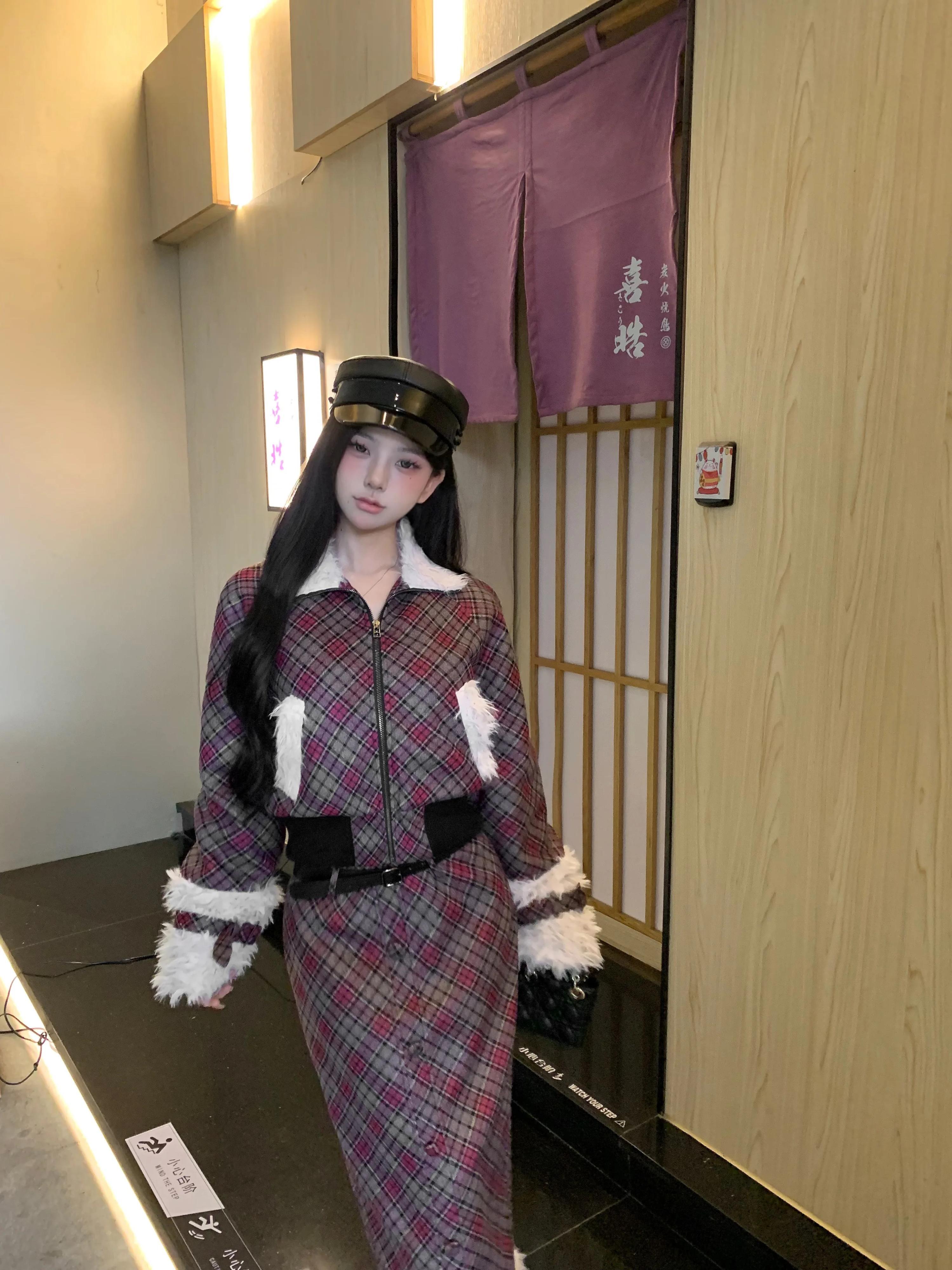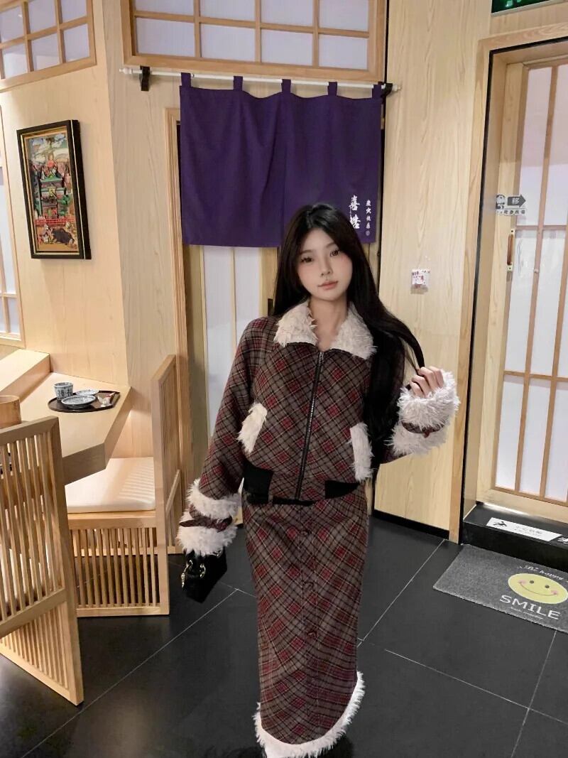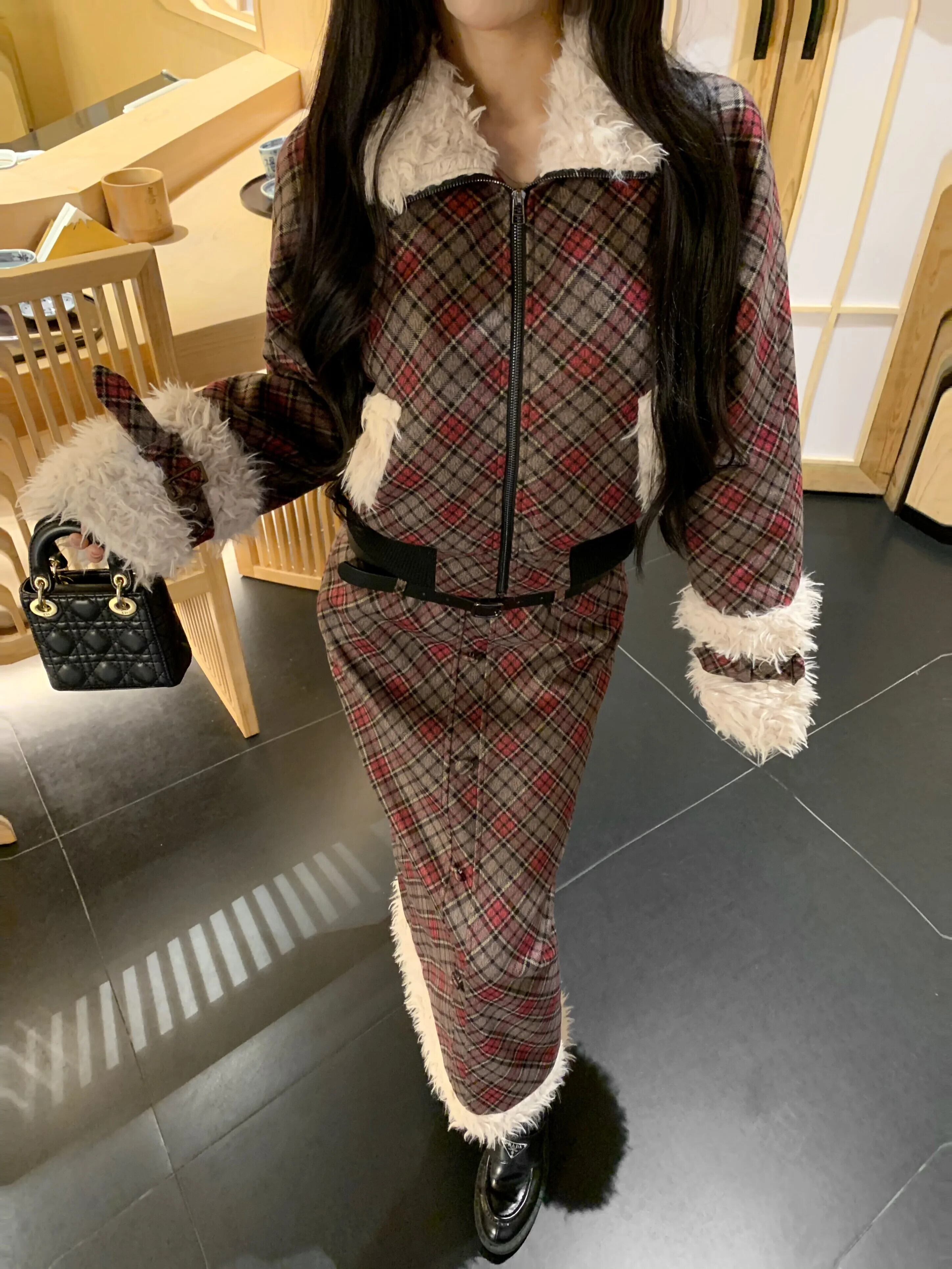 フレンチスイートホットガール冬チェック柄ぬいぐるみパネルコートウエストロングスカートツーピースセット 大人ガーリー スウィート キュート カジュアル ウィンター 冬物