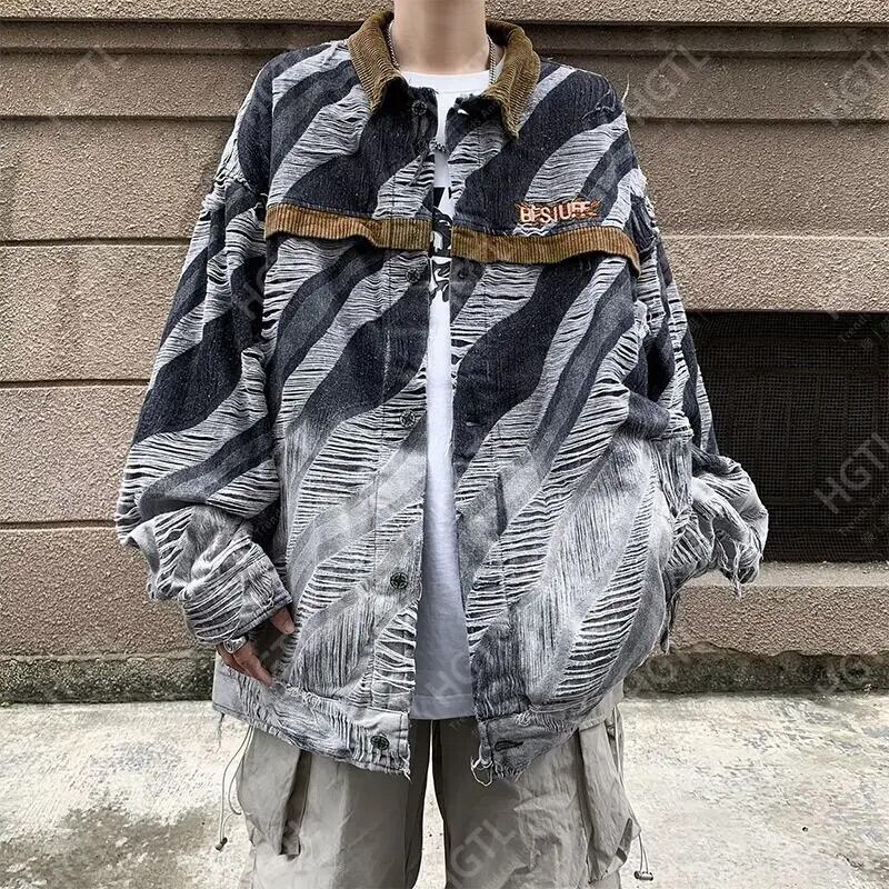 ヒップホップ引き裂かれたデニムジャケットメンズ春と秋トレンド雰囲気アメリカンストリートオーバーサイズカーゴジャケット男性 スプリング 春物 オータム 秋物