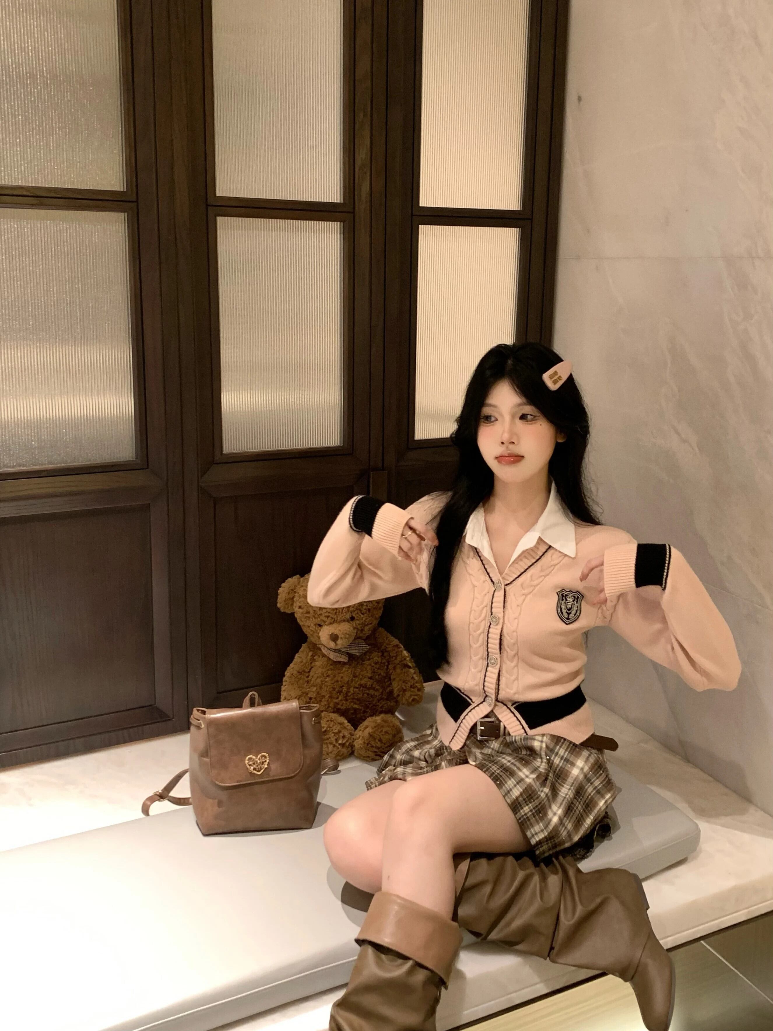 プレッピー スタイル スーツ レディース 秋 V ネック ショート 長袖 ニット ウエスト スパンコール チェック柄 スカート 2 点セット ロング オータム 秋物 Vネック