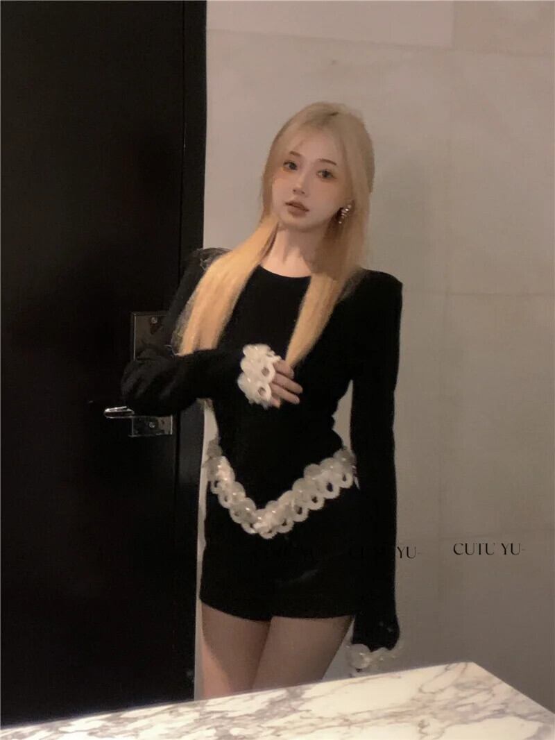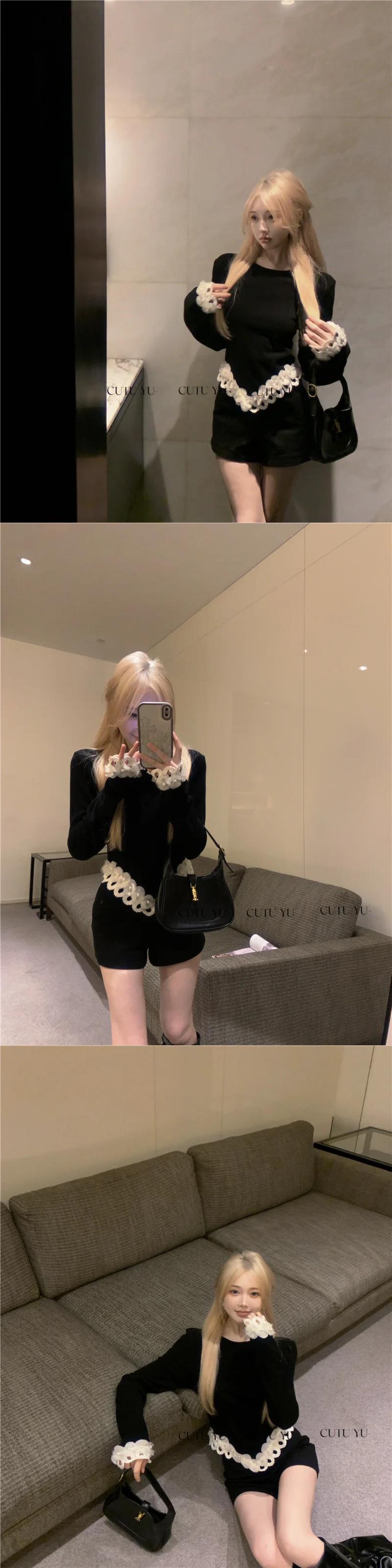 フレンチスイートホットガールスーツ秋/冬 O ネック長袖トップウエストショーツ 2 点セット ロング 大人ガーリー スウィート キュート カジュアル オータム 秋物 ウィンター 冬物 ブルマー Oネック