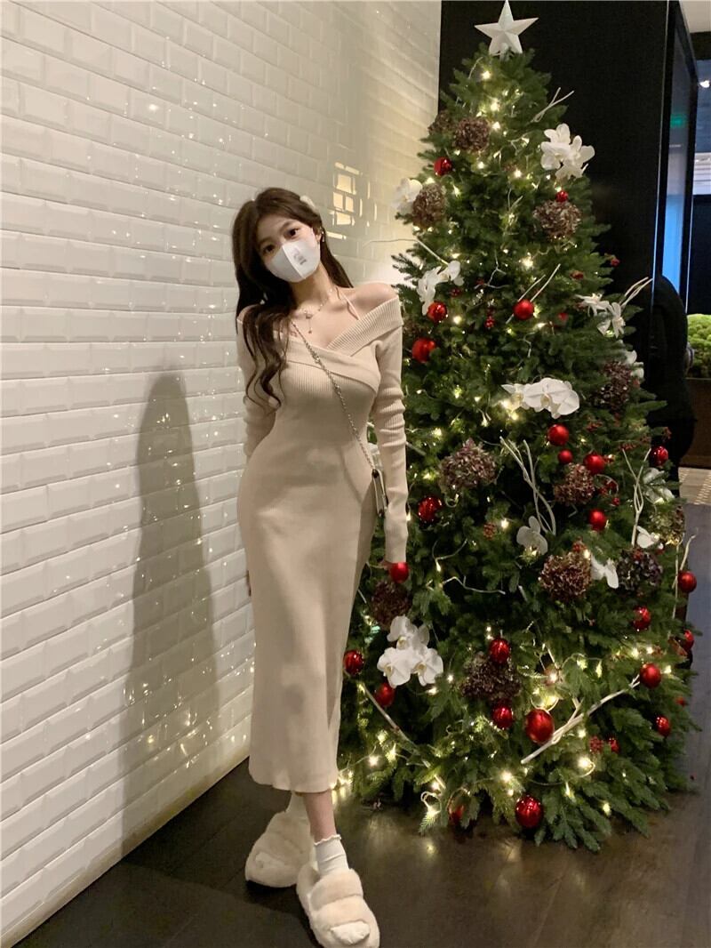 Sweet Girl 純粋セクシー V ネックホルターネックニットドレス秋/冬スリムフィットオフショルダーラップヒップロングドレス 大人ガーリー スウィート キュート カジュアル オータム 秋物 ウィンター 冬物 Vネック ピュア