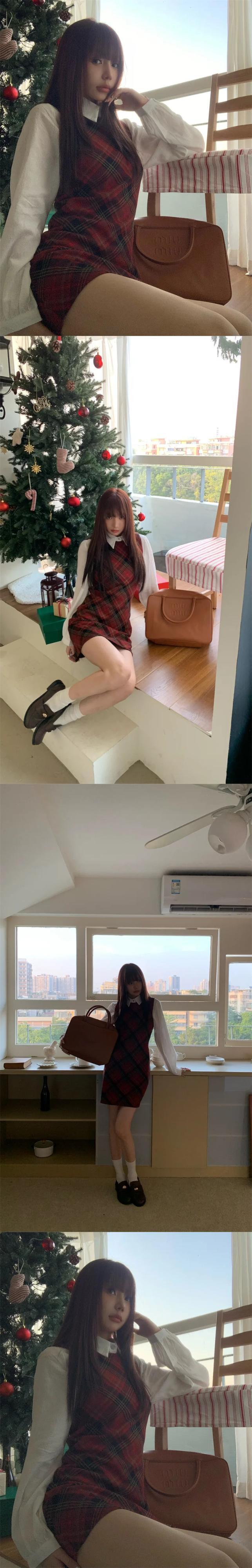 甘いホットガールレトロレッドスーツ秋チェック柄ノースリーブドレスバブルスリーブシャツツーピースセット 大人ガーリー スウィート キュート カジュアル オータム 秋物