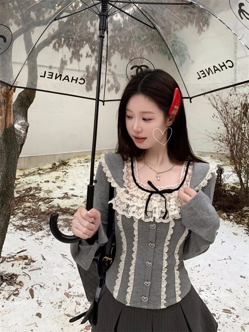 甘いホットガールレーススプライシングボトムシャツ秋/冬スクエアカラーソリッドフェイクツーピーストップ 大人ガーリー スウィート キュート カジュアル オータム 秋物 ウィンター 冬物 ソリッドカラー スクウェア
