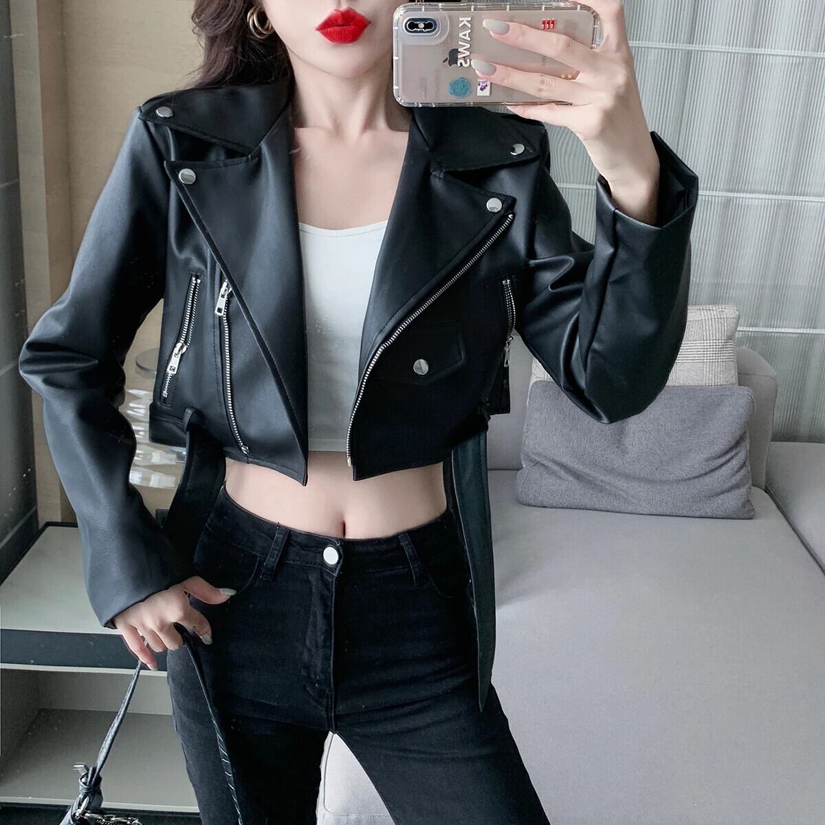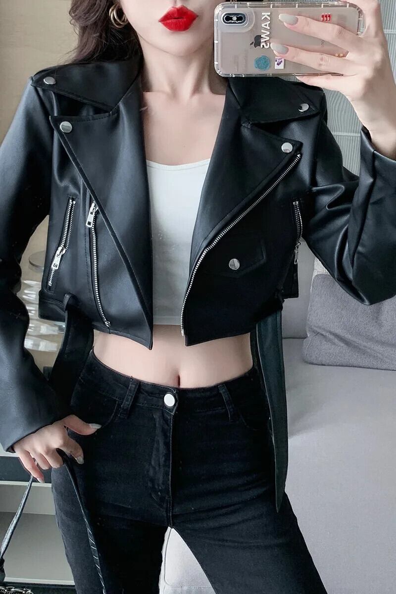 甘いホットガールオートバイ Pu レザージャケット秋ラペル長袖スリムショートジャケット ロング 大人ガーリー スウィート キュート カジュアル オータム 秋物