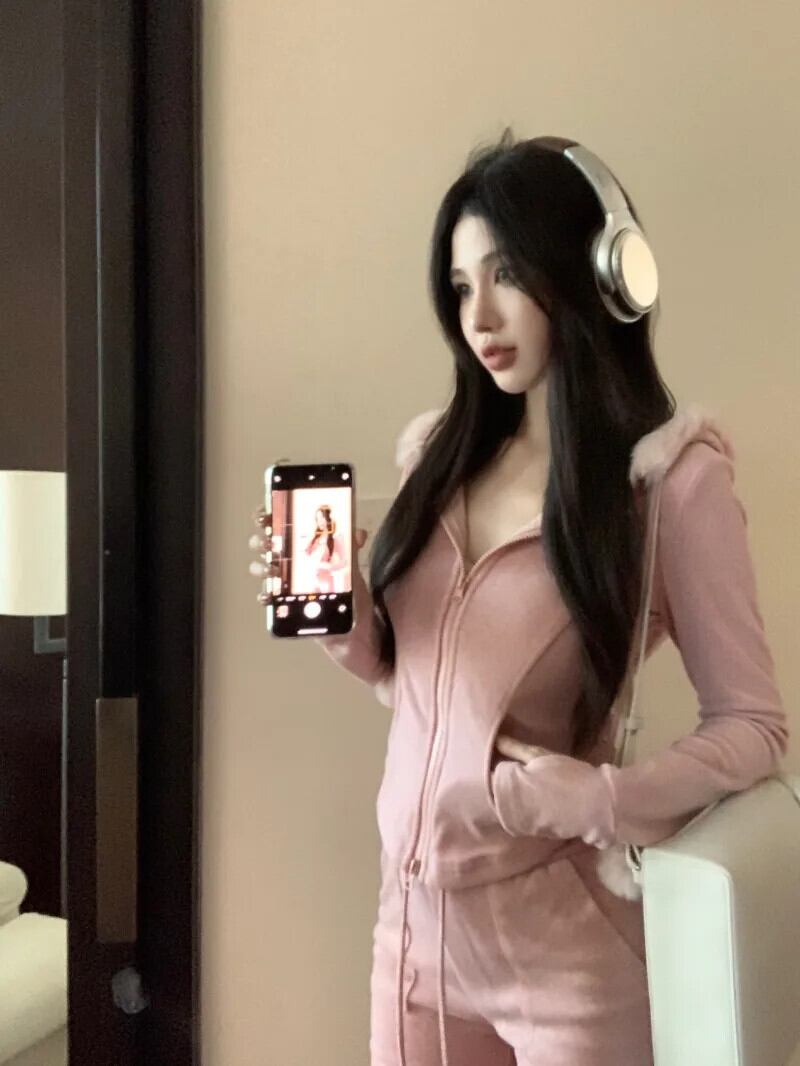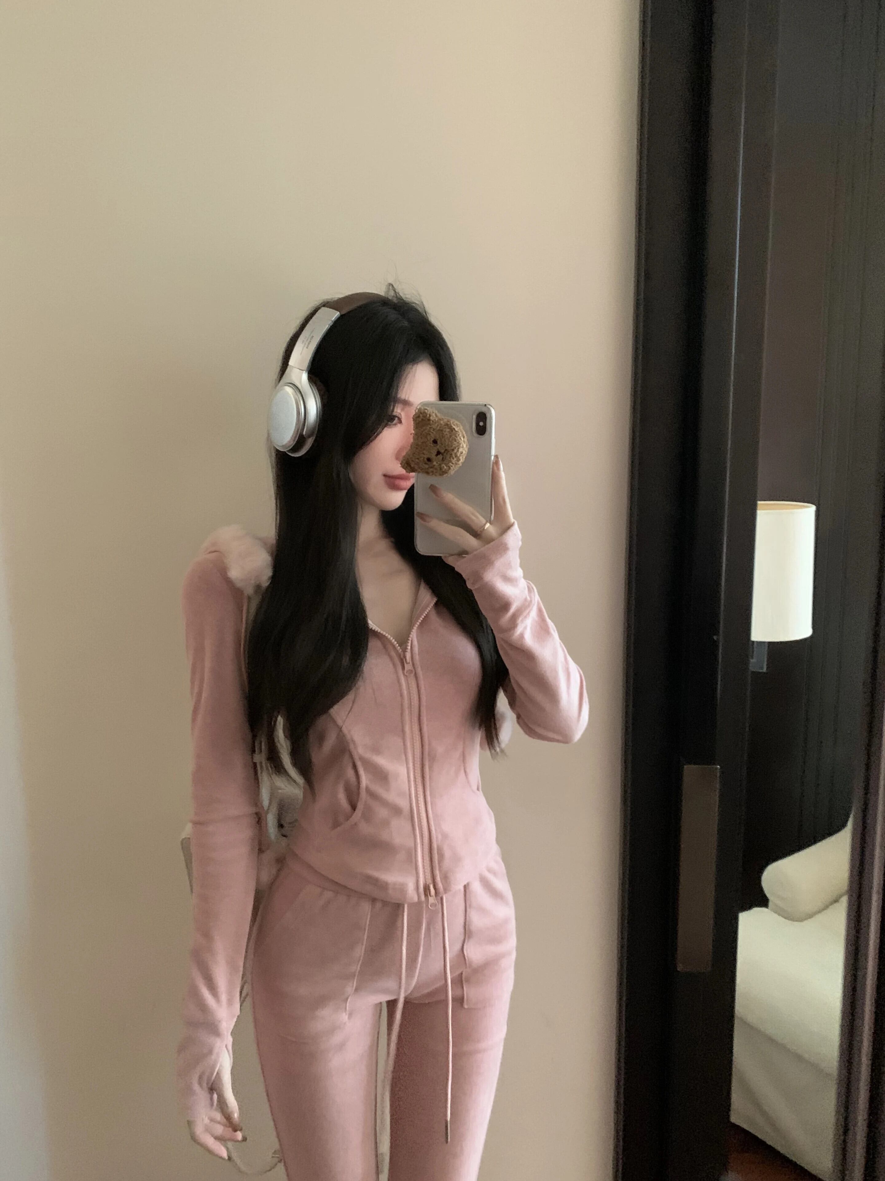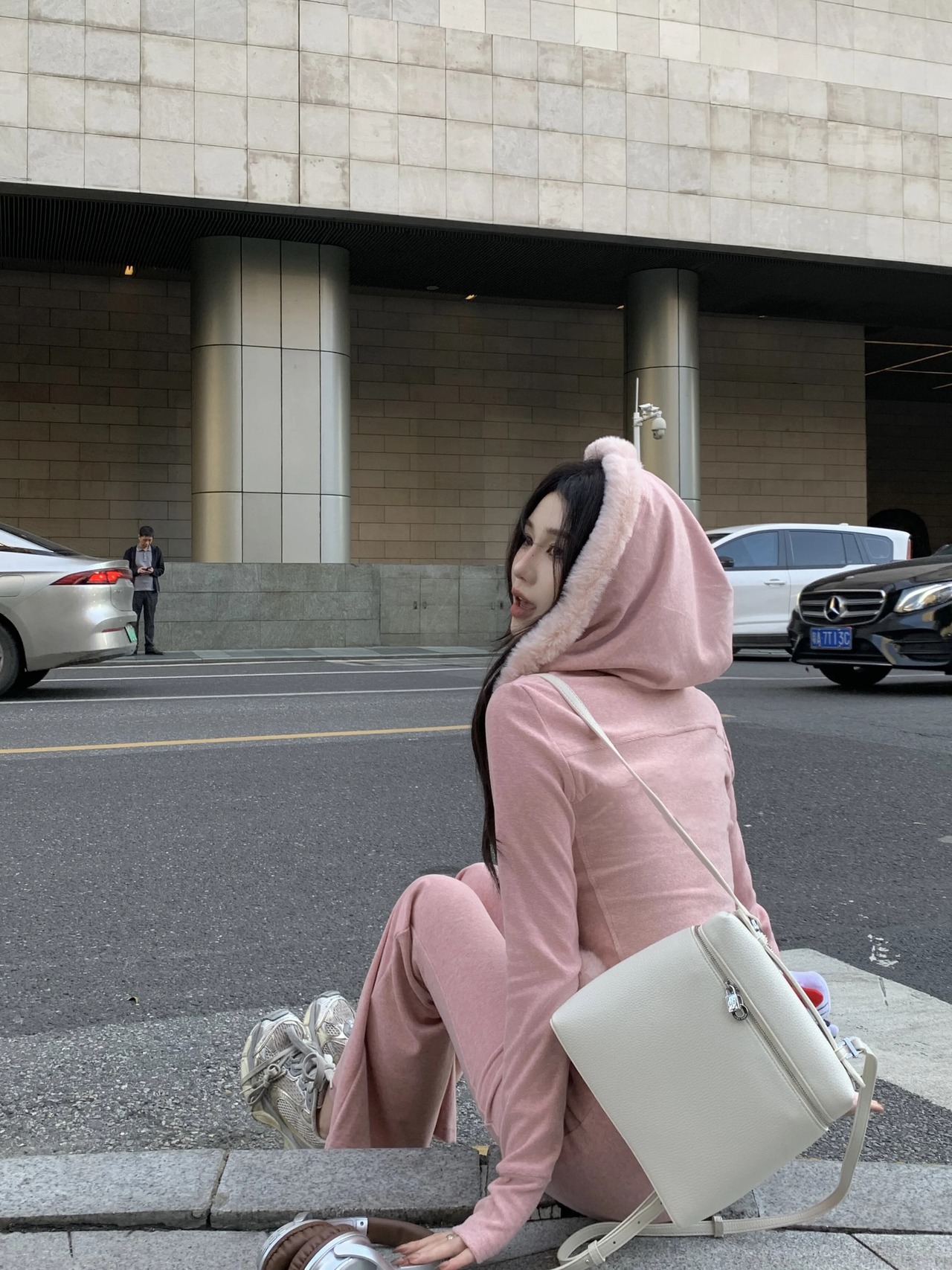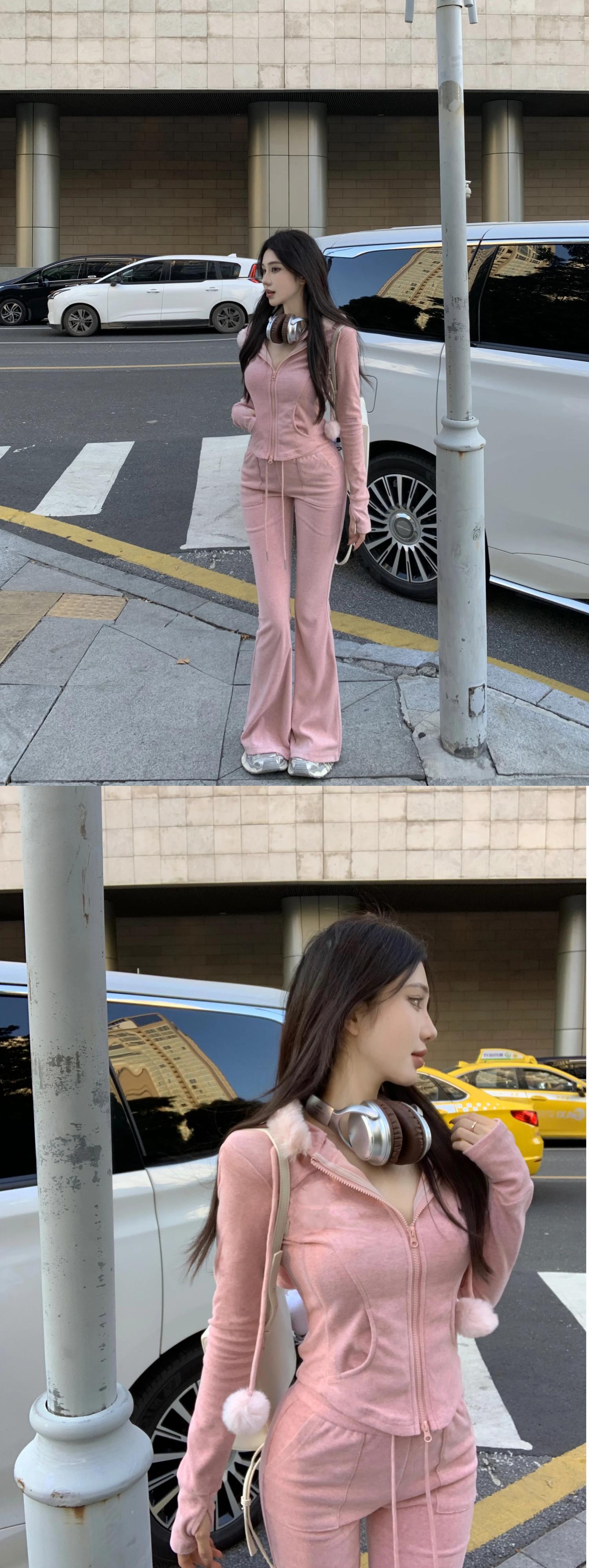 甘いホットガールスポーツスーツ秋/冬ピンクぬいぐるみフード付きコートフレアパンツツーピースセット 大人ガーリー スウィート キュート カジュアル オータム 秋物 ウィンター 冬物