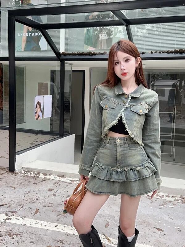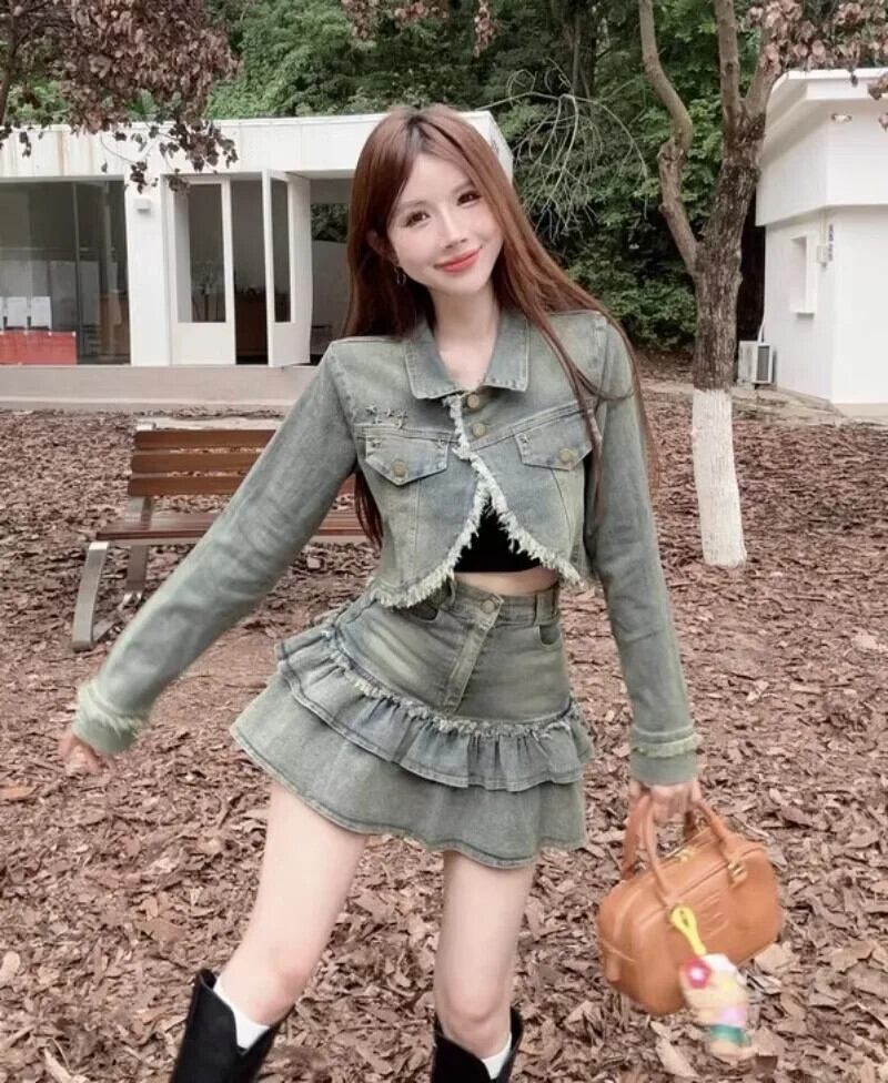 甘いホットガールスーツ秋不規則デニムコートウエストプリーツショートスカートツーピースセット 大人ガーリー スウィート キュート カジュアル オータム 秋物