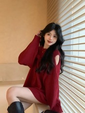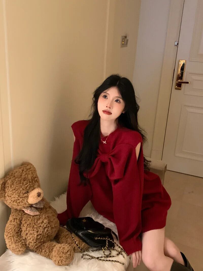 スイートホットガールレッドボウセーター秋/冬 O ネックオフショルダールーズニットプルオーバー リボン 大人ガーリー スウィート キュート カジュアル オータム 秋物 ウィンター 冬物 Oネック