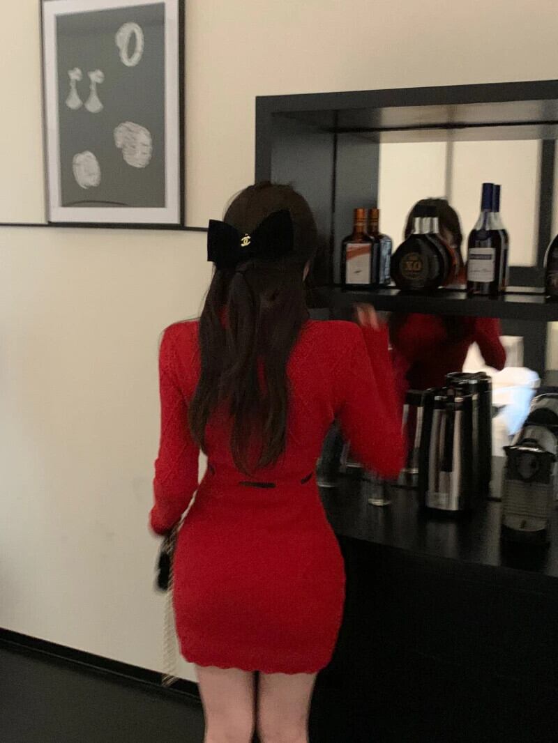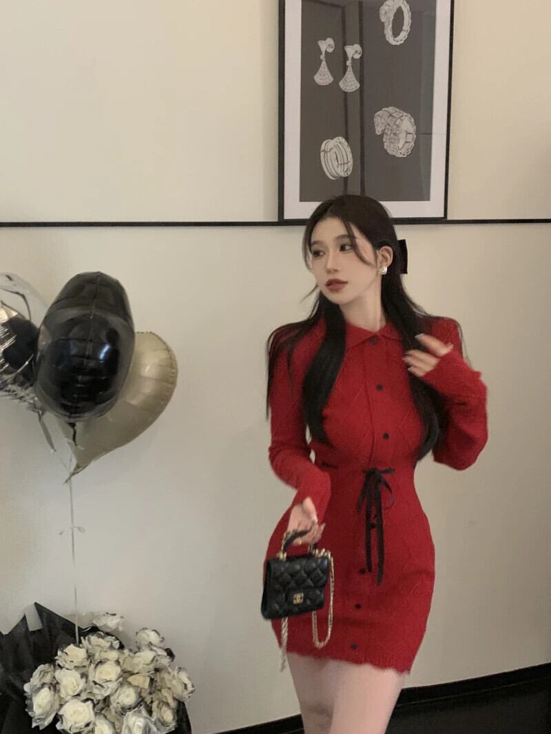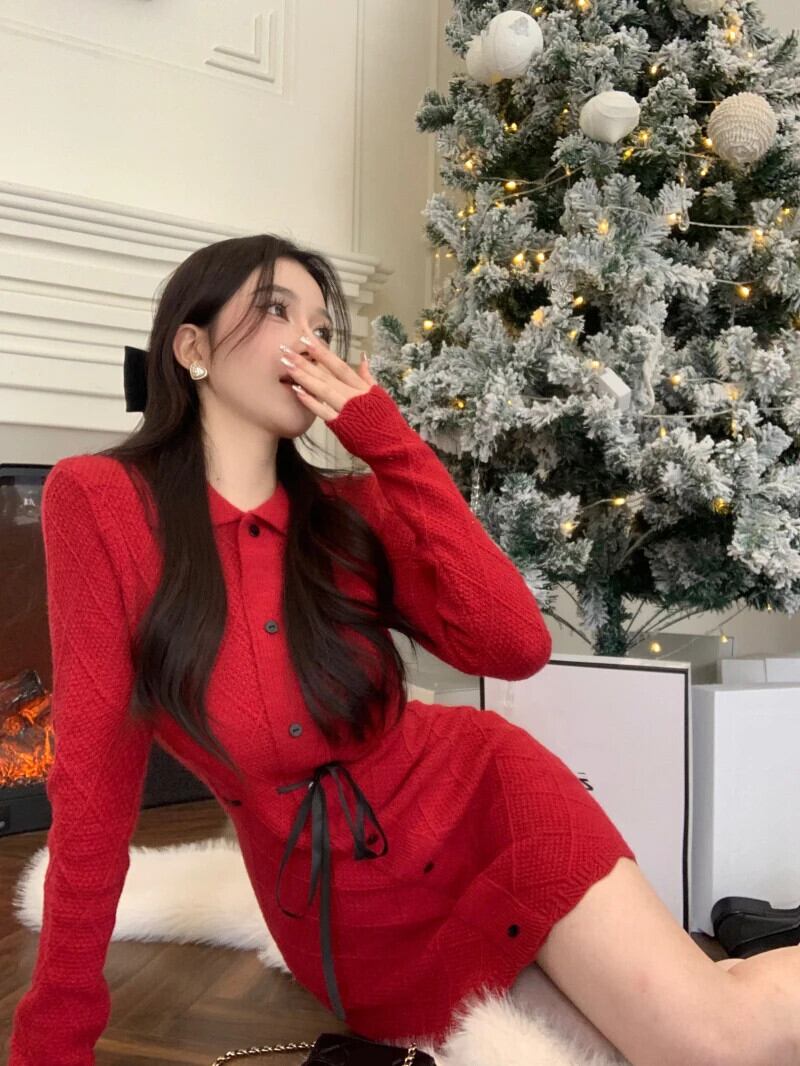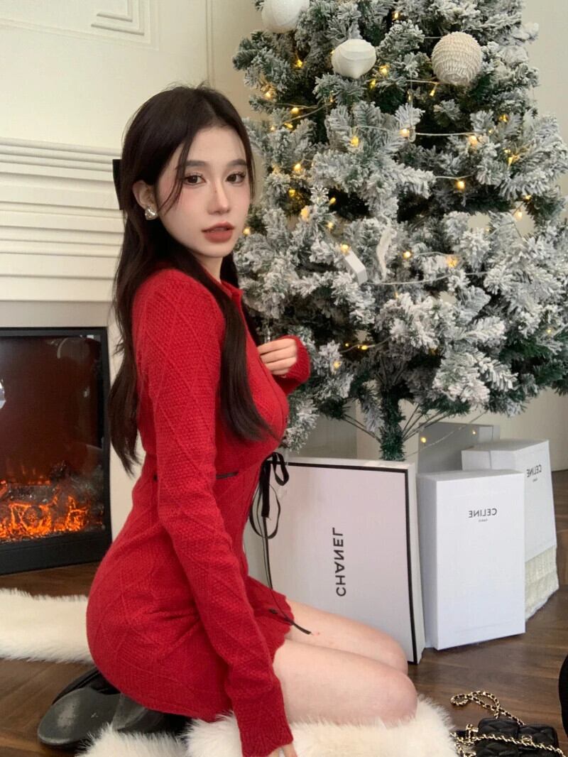 スウィートガールクリスマススリムフィットニットドレス秋/冬フレア袖ラップヒップショートドレス フレアスリーブ 大人ガーリー キュート カジュアル オータム 秋物 ウィンター 冬物