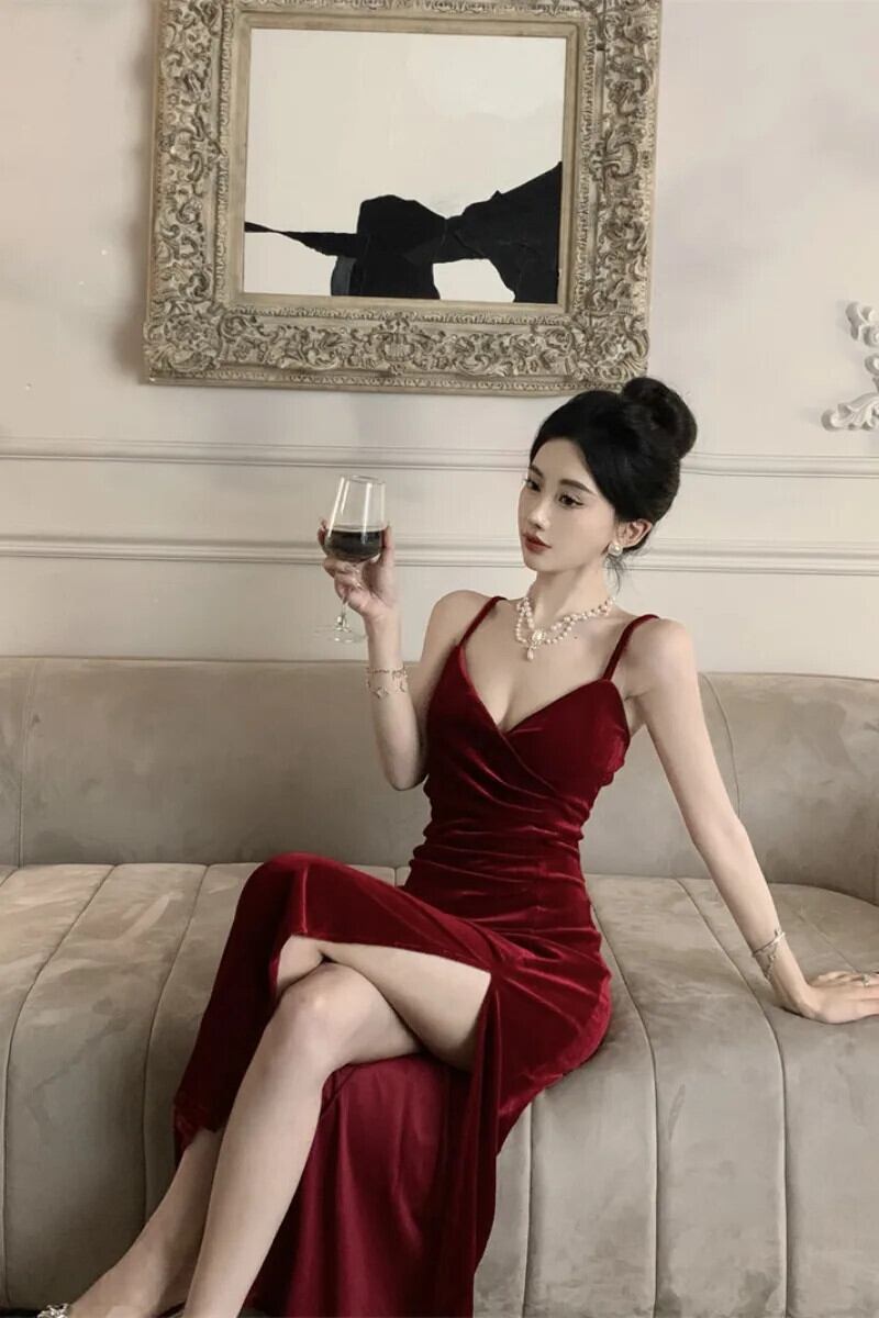 甘いホットガールベルベットストラップドレス秋/冬 V ネックスリムフィットボトムスプリットイブニングロングドレス 大人ガーリー スウィート キュート カジュアル オータム 秋物 ウィンター 冬物 Vネック