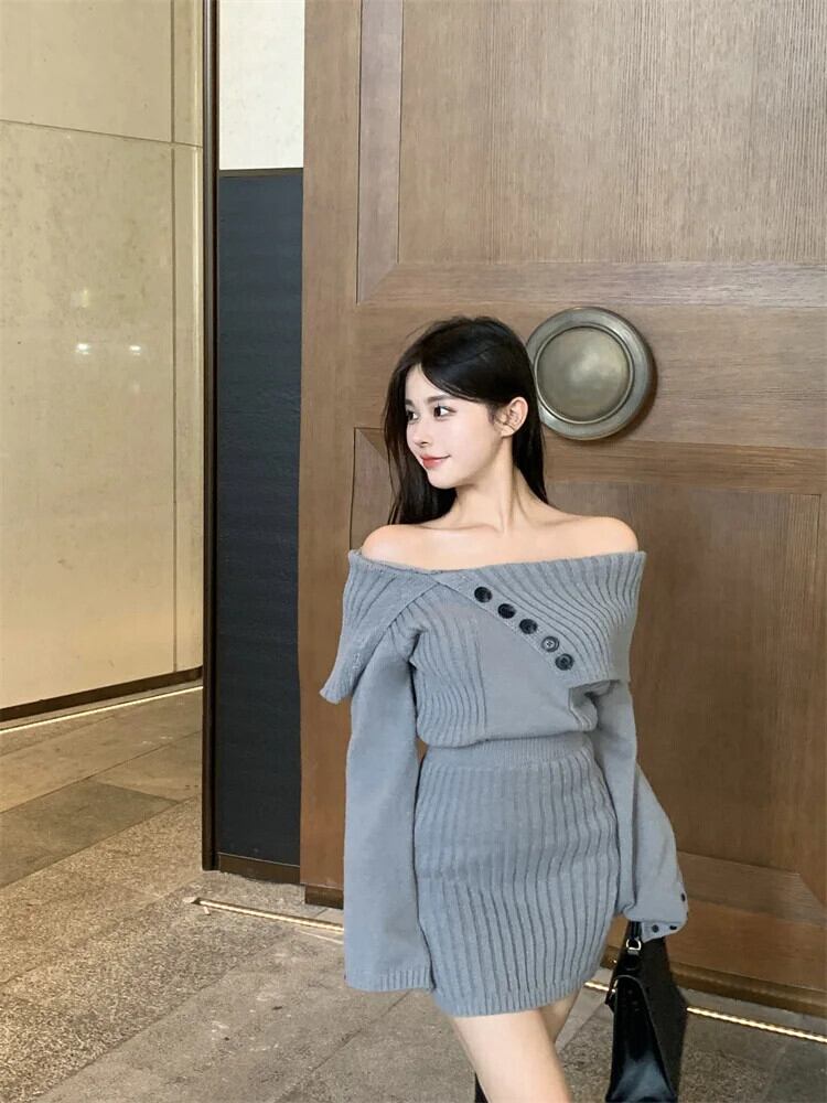 スイートガールスーツ秋/冬グレーオフショルダー長袖セーターラップヒップミニスカートツーピースセット ロング 大人ガーリー スウィート キュート カジュアル オータム 秋物 ウィンター 冬物