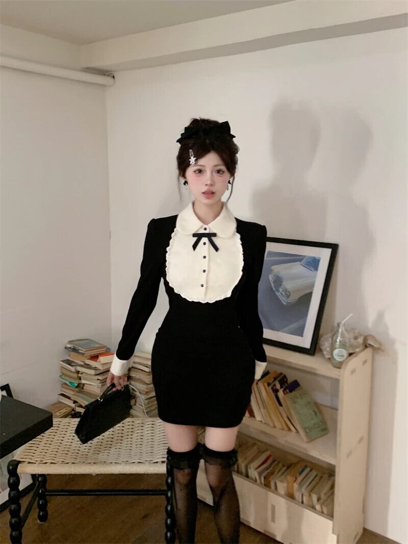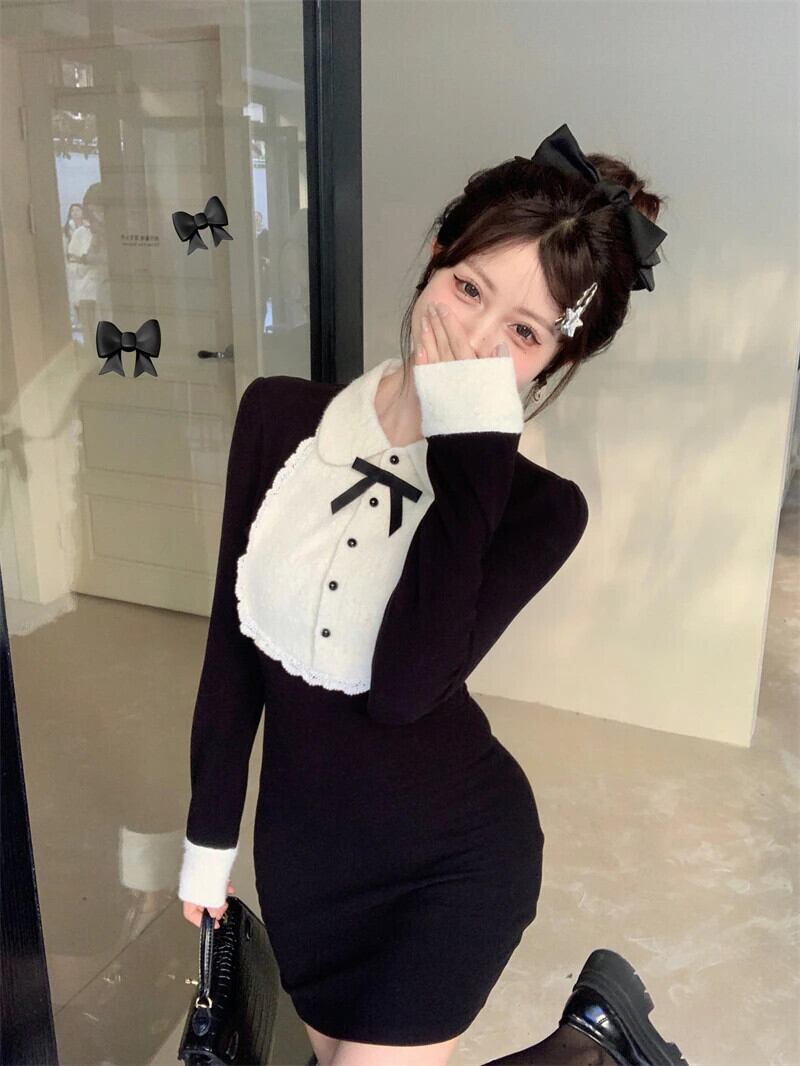 スウィートガールレースターンダウン襟長袖ドレス秋/冬セクシータイトラップヒップショートドレス ロング 大人ガーリー キュート カジュアル オータム 秋物 ウィンター 冬物