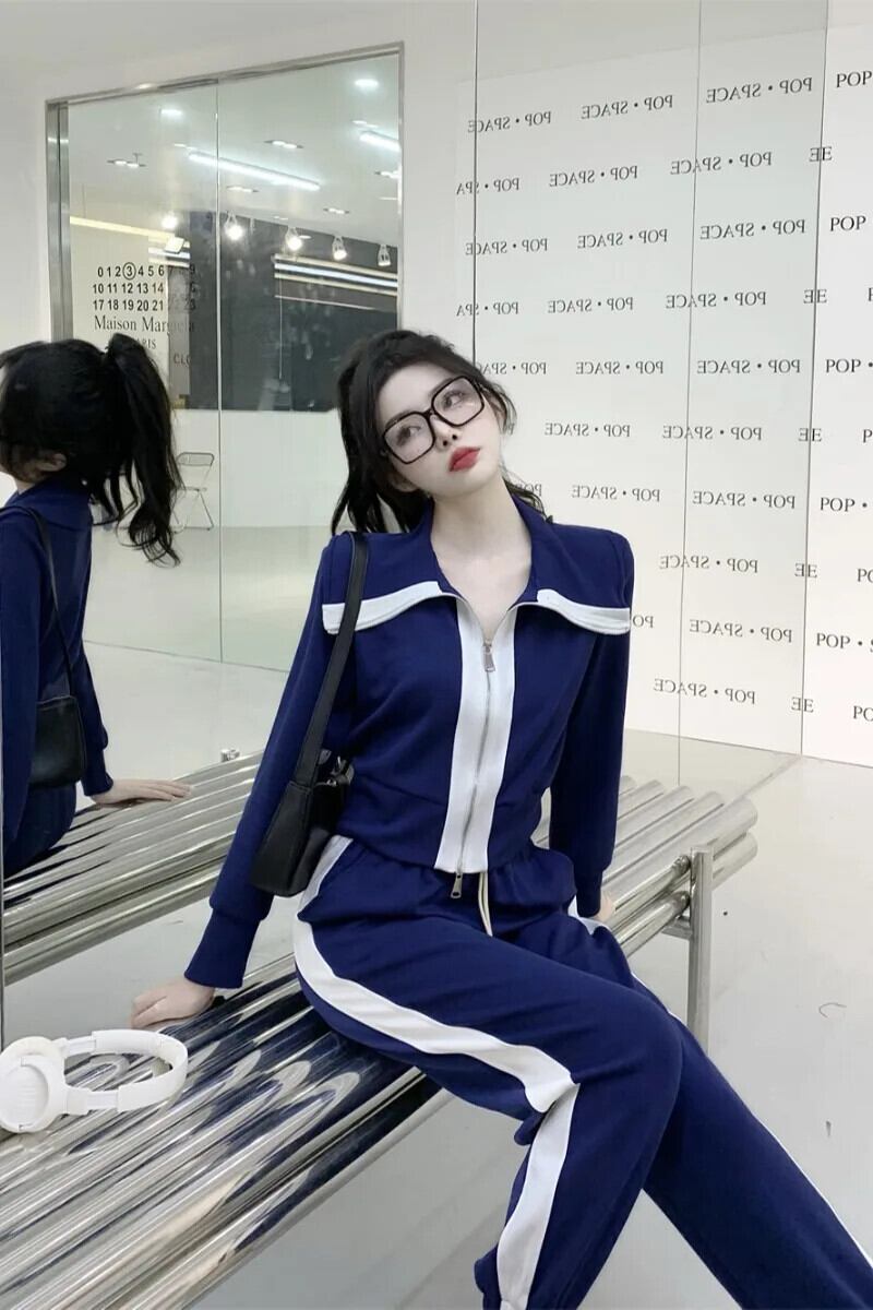 ホットガールスーツラペル長袖ジャケット弾性ウエストレースアップパンツツーピースセット ロング エラスティック 伸縮