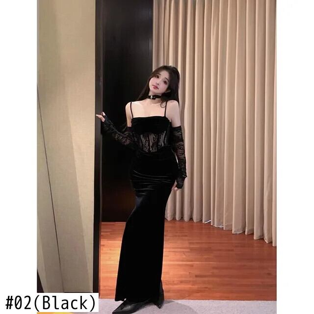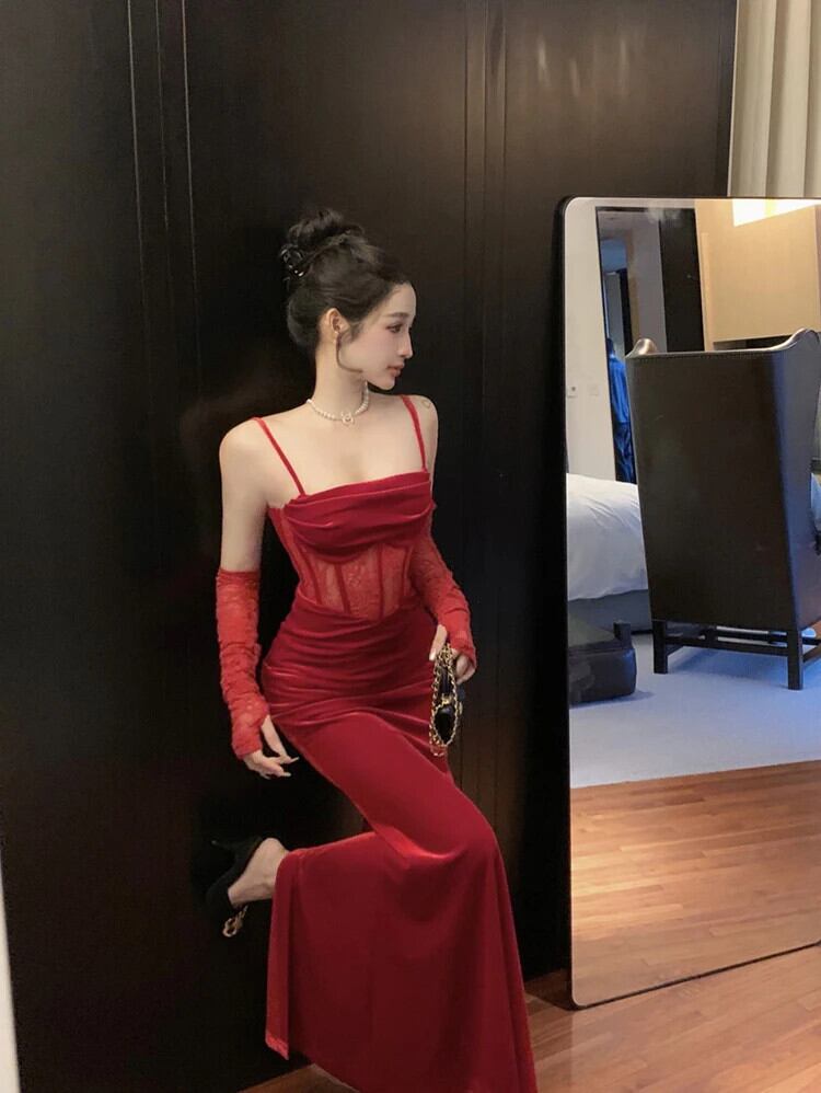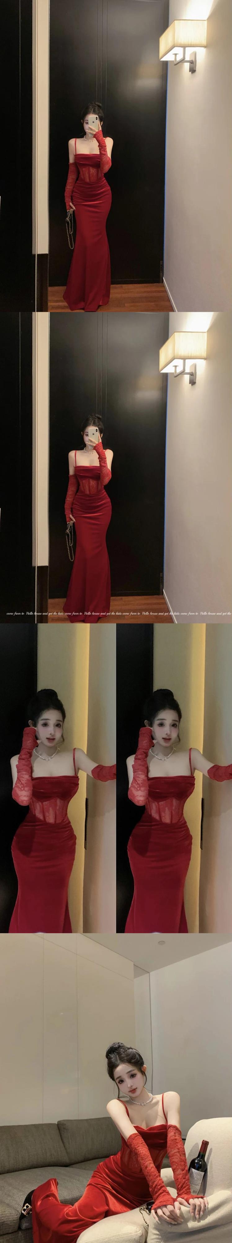ホットガールクリスマスセクシーイブニングドレス秋/冬魚骨レーススリムフィットベルベットストラップドレス オータム 秋物 ウィンター 冬物