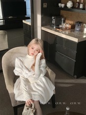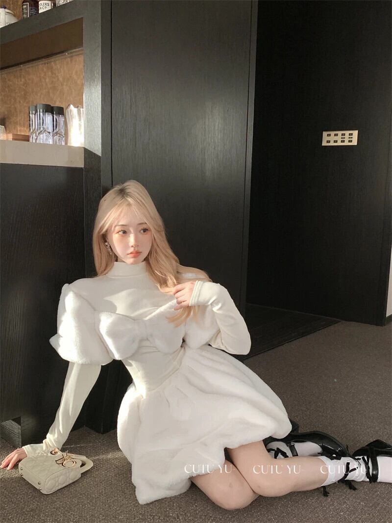 甘いホットガールボウハーフネックドレス秋/冬スリムフィット長袖 A ラインふわふわドレス ロング リボン 大人ガーリー スウィート キュート カジュアル オータム 秋物 ウィンター 冬物 Aライン