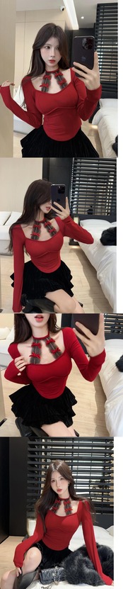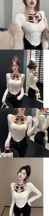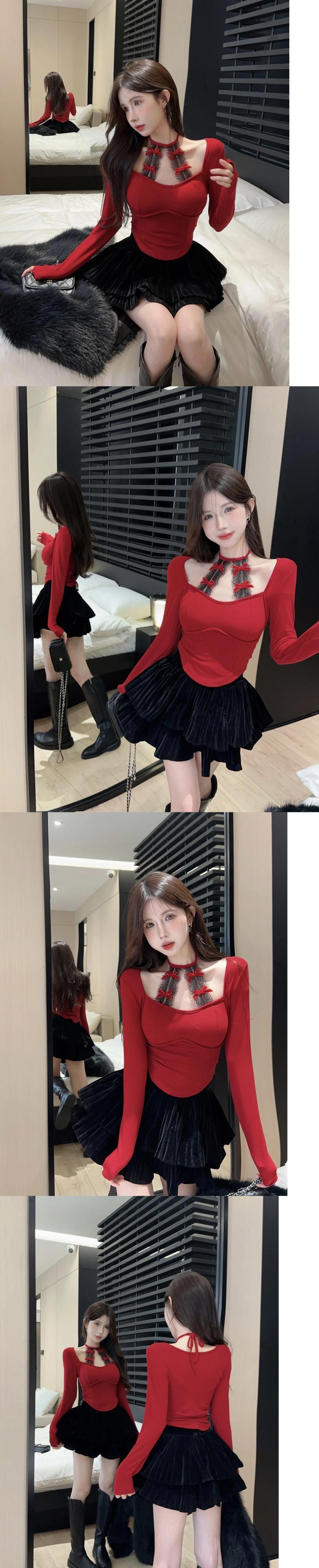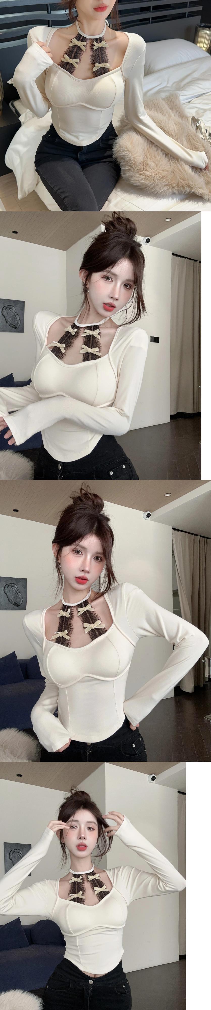 ホットガールホルターネックレースボトム長袖 Tシャツ秋と冬ブラックスリムフィットショートトップ ロング オータム 秋物 ウィンター 冬物