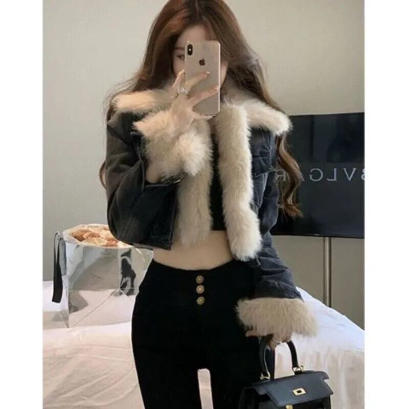 ホットガール黒肥厚綿デニムジャケット対照的毛皮レトロショート暖かい綿ジャケット ブラック コットン