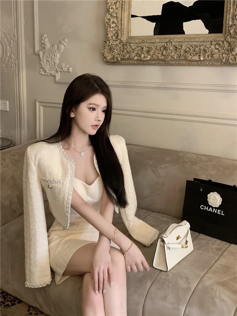 甘いホットガールスーツ冬ラインストーンドレス O ネック長袖ショートコート 2 点セット ロング 大人ガーリー スウィート キュート カジュアル ウィンター 冬物 Oネック シルク