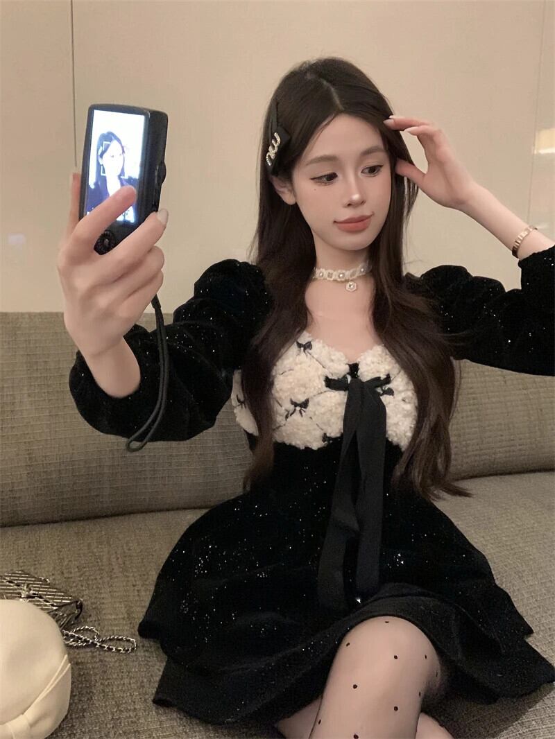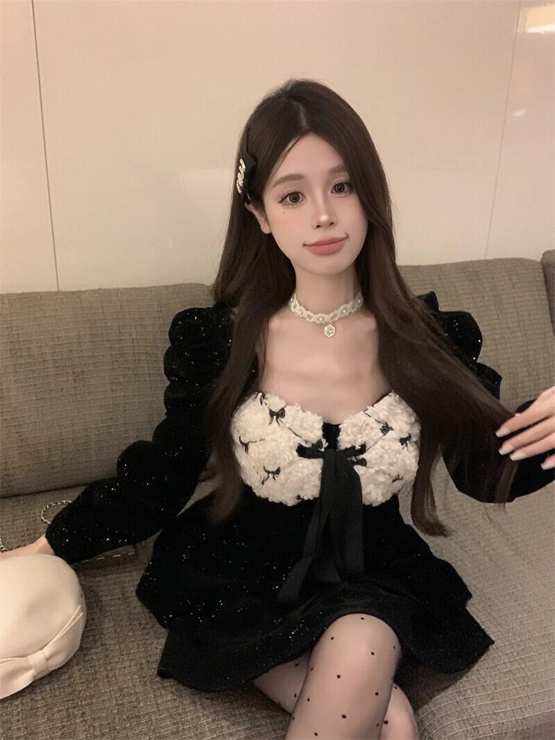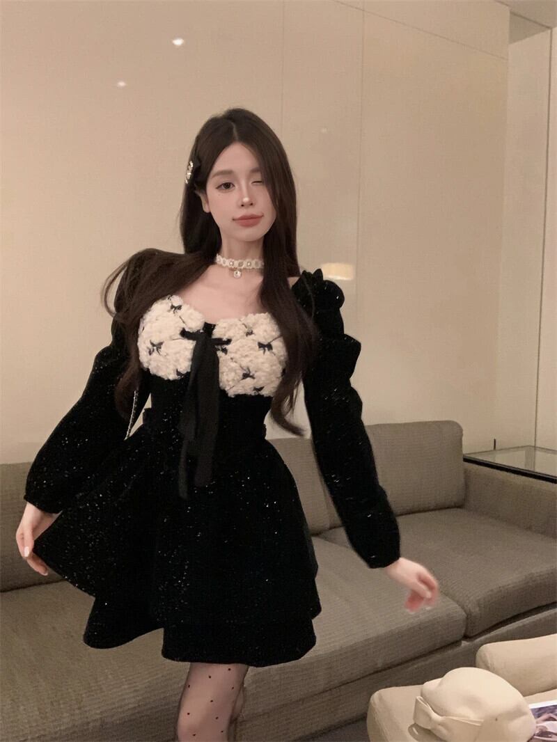 Sweet Girl ぬいぐるみパッチワークスクエアカラードレス秋と冬ブラックスリムフィットふわふわケーキショートドレス 大人ガーリー スウィート キュート カジュアル オータム 秋物 ウィンター 冬物 スクウェア