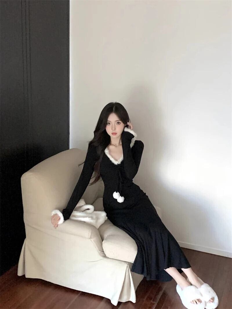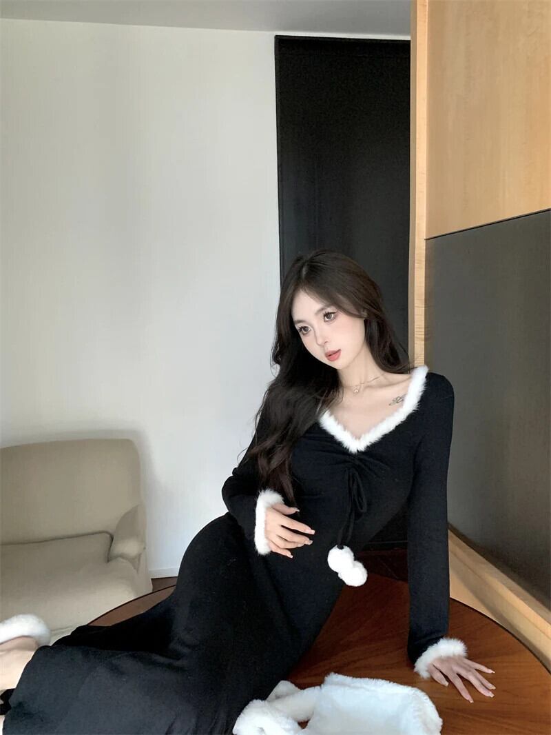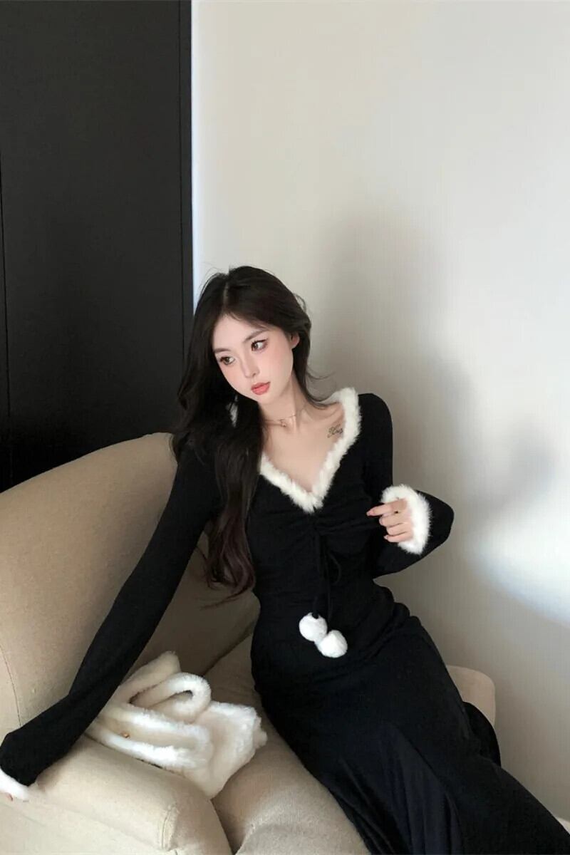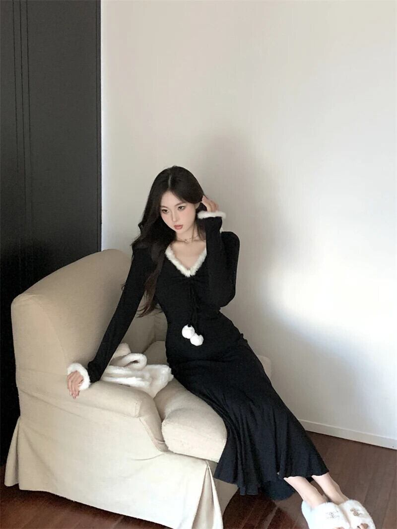 甘いホットガール豪華 V ネック黒長袖ドレス秋/冬スリムフィットマーメイドロングドレス ブラック 大人ガーリー スウィート キュート カジュアル オータム 秋物 ウィンター 冬物 Vネック