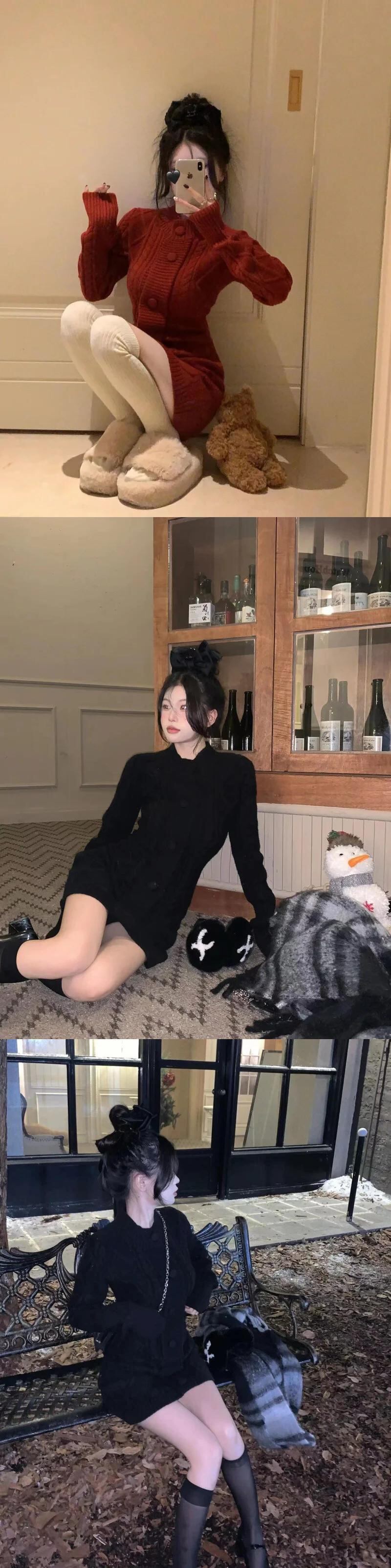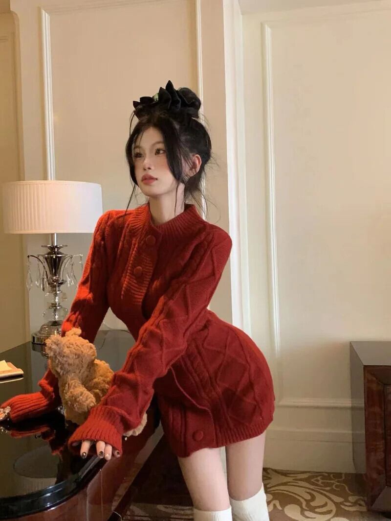 甘いホットガールレトロツイストドレス秋スリムスタンドカラーニット肥厚セータードレス 大人ガーリー スウィート キュート カジュアル オータム 秋物