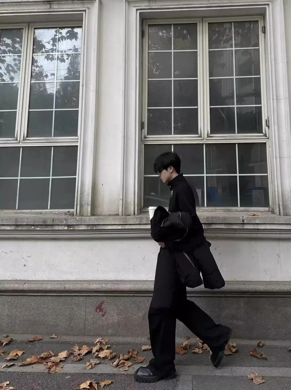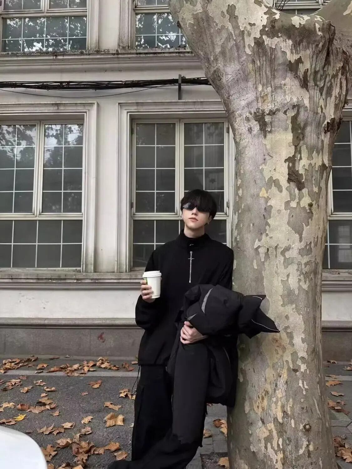 ストリート黒ハーフジッパートレーナーメンズルーズ長袖スタンドカラー肩パッドコートクール男性 ロング ブラック