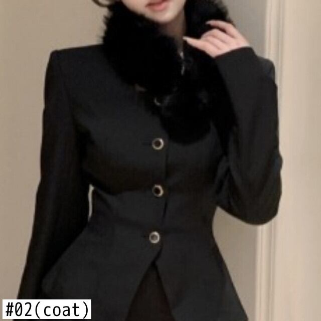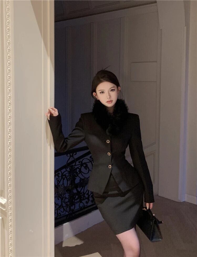オフィスレディ通勤スーツ秋/冬ファー襟コートラップヒップショートスカート 2 点セット オータム 秋物 ウィンター 冬物 会社 学校 通勤や通学にも