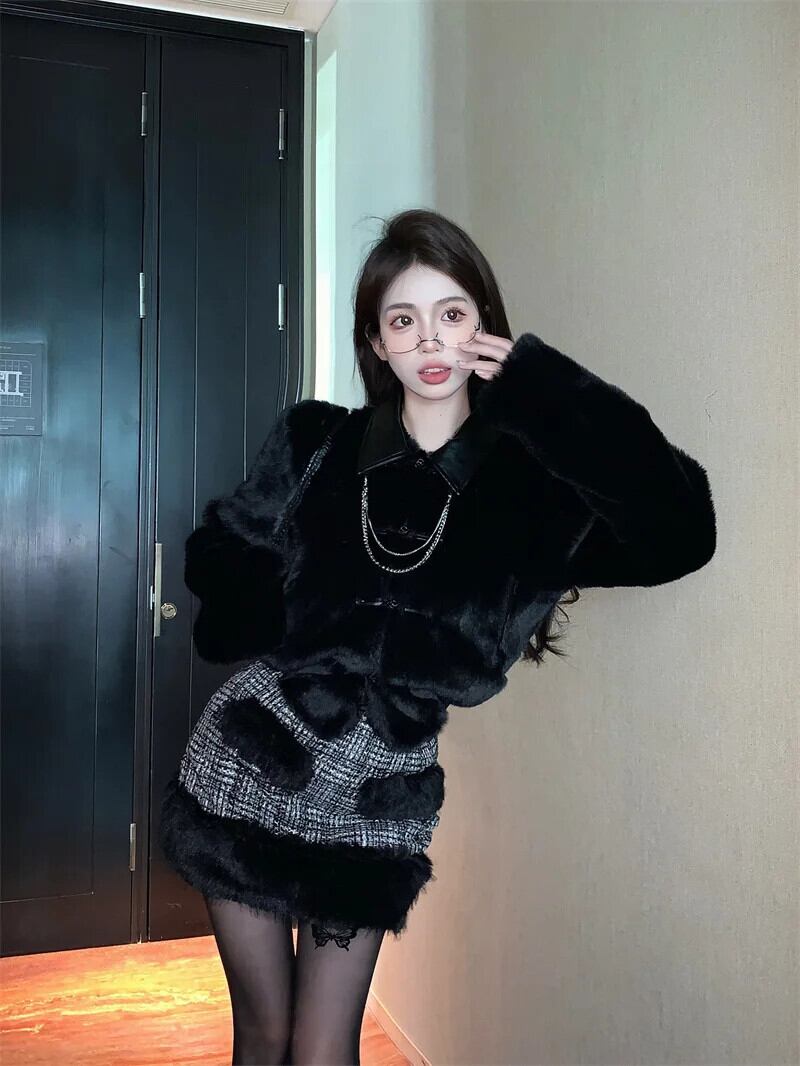 スイートガールスーツ秋/冬フェイクファーコートウエストチェック柄ショートスカートツーピースセット 大人ガーリー スウィート キュート カジュアル オータム 秋物 ウィンター 冬物